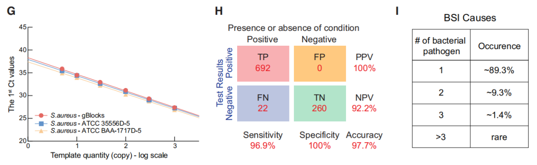 作者分别对21个菌种进行分析检出限(LoD)评估。结果显示,CCMA在所有物种中成功检测了30个拷贝。在21种细菌中,有12种(如单核增生李斯特菌)的LoD低至5拷贝(上图F)。且CCMA允许精确定量的DNA目标,校准曲线的测定系数范围为0.994 ~ 0.999(下图G),具有非常好的准确性和重复性。