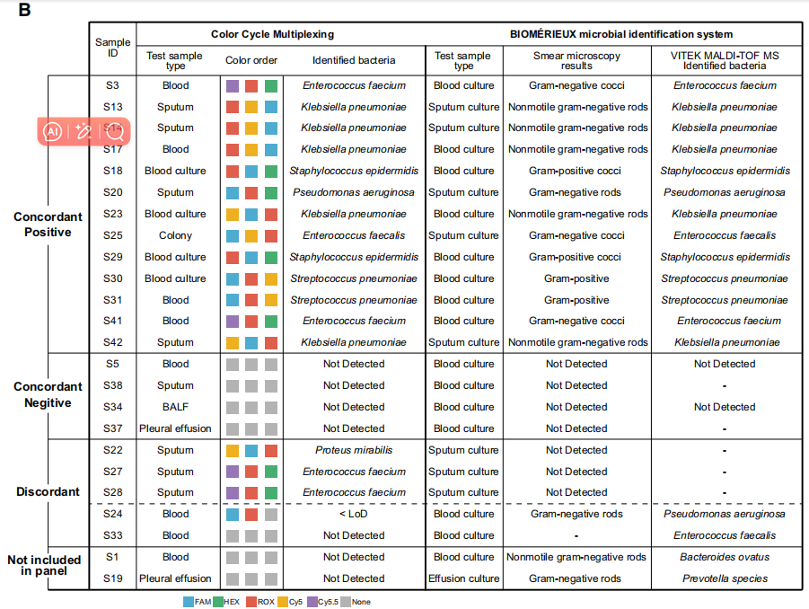 CCMA允许使用传统的qPCR仪器在单管反应中同时筛选许多不同的DNA目标。不同荧光团的Ct值的编程定时延迟为增加CCMA的复杂性提供了一个强大的机制。使用CCMA使用4个荧光通道设计一个用于检测21种败血症相关病原体DNA的大规模多重qPCR panel,作者成功地将CCMA 21种病原菌检测panel应用于临床样品,并将检测结果与“金标准”交叉验证。总体而言,两种方法的鉴定结果显示出相当好的一致性(85%),无论样品类型的变化。与细菌培养和检测方法相比,CCMA无需细菌培养即可识别临床样品中是否存在细菌,将周转时间从几天缩短到几小时。此外,与传统方法相比,CCMA检测的临床样本量要求大大降低。