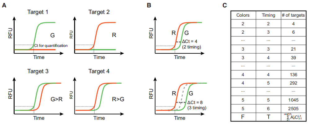 在CCMA中,DNA靶标是根据荧光出现的顺序来识别的(图A)。荧光依次出现是通过使用寡核苷酸阻滞剂在qPCR Ct中合理设计延迟来实现的。随着所使用的荧光通道数量,以及可编程的Ct延迟的数量的增加,可以区分的目标数量呈指数增长(图C)。