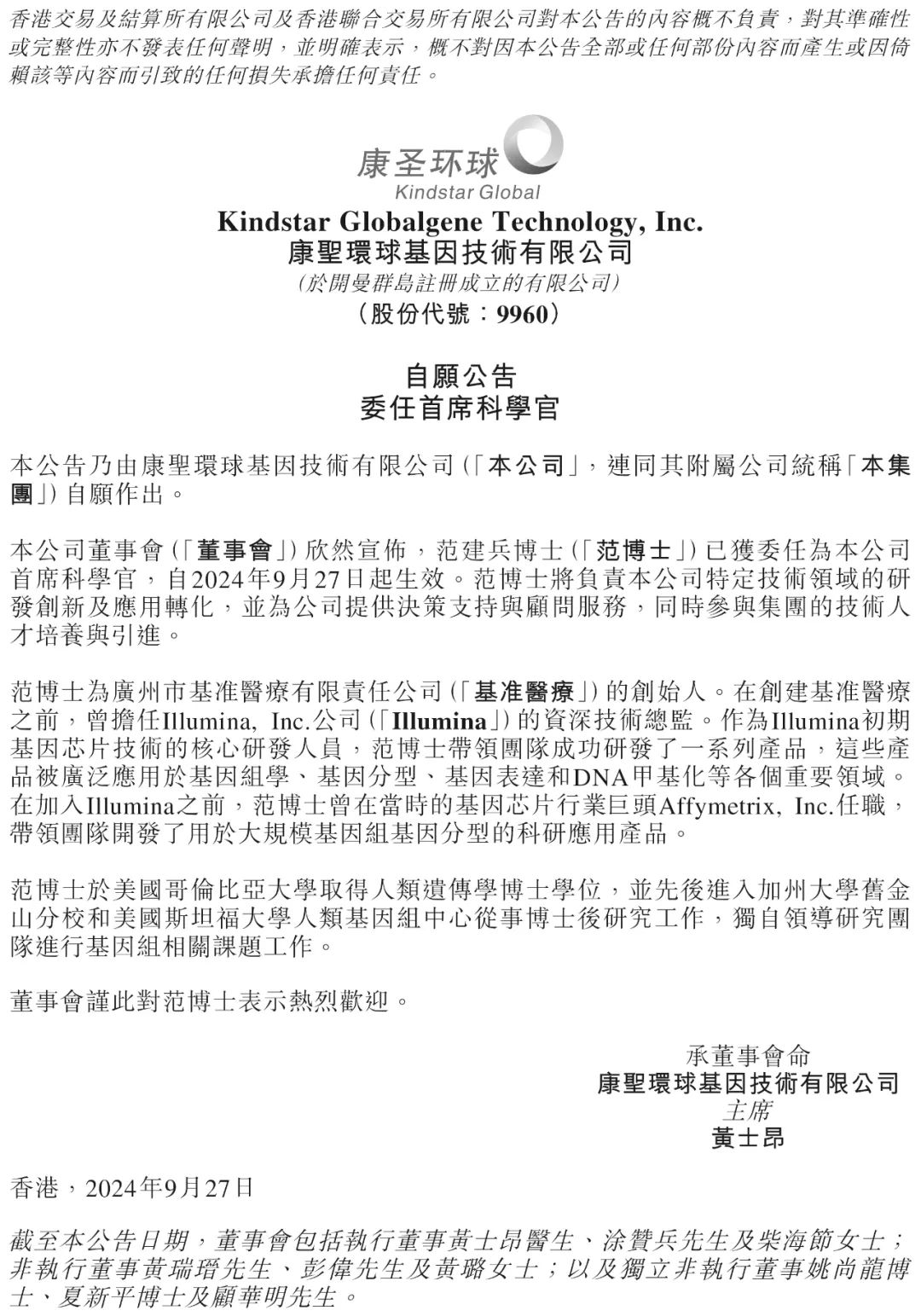 2024年9月27日,康圣环球欣然宣布,范建兵博士(「范博士」)已获委任为公司首席科学官,自2024年9月27日起生效。范博士将负责本公司特定技术领域的研发创新及应用转化,并为公司提供决策支持与顾问服务,同时参与集团的技术人才培养与引进。 范博士为广州市基准医疗有限责任公司(「基准医疗」)的创始人。在创建基准医疗之前,曾担任Illumina, Inc.公司(「Illumina」)的资深技术总监。作为Illumina初期基因芯片技术的核心研发人员,范博士带领团队成功研发了一系列产品,这些产品被广泛应用于基因组学、基因分型、基因表达和DNA甲基化等各个重要领域。在加入Illumina之前,范博士曾在当时的基因芯片行业巨头Affymetrix, Inc.任职,带领团队开发了用于大规模基因组基因分型的科研应用产品。 范博士于美国哥伦比亚大学取得人类遗传学博士学位,并先后进入美国加州大学旧金山分校和美国斯坦福大学人类基因组中心从事博士后研究工作,独自领导研究团队进行基因组相关课题工作。 本公司创始人兼首席执行官黄士昂教授表示:“我们很高兴能与范博士合作。范博士为人类遗传学领域的专家,拥有30年从事人类基因组学、基因芯片及高通量测序技术开发的经验。我们期待范博士及其团队在肿瘤早筛早诊领域的独特经验继续带领基准医疗前进,也在康圣环球这个充满机遇的平台发挥作用。” 范建兵博士表示:“我非常荣幸能加入康圣环球,为集团构建“全面、系统、先进”的专业特检平台贡献力量。我将与集团现有的优秀科研团队一起努力,推进癌症早筛早诊产品的研发与转化,为更多的患者带来生命的希望与转机。” |