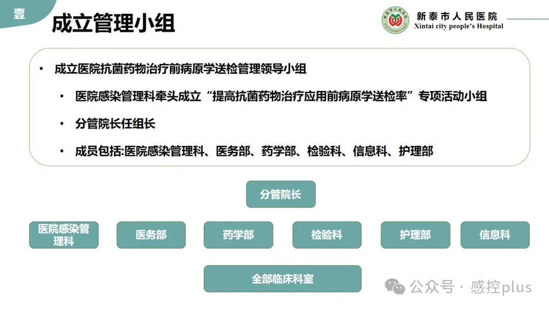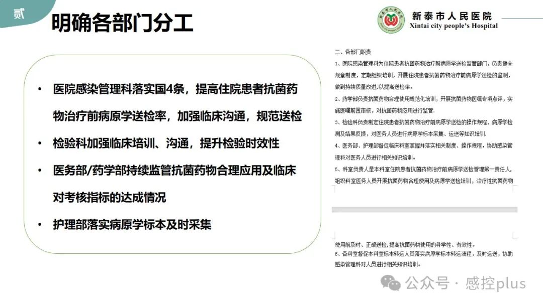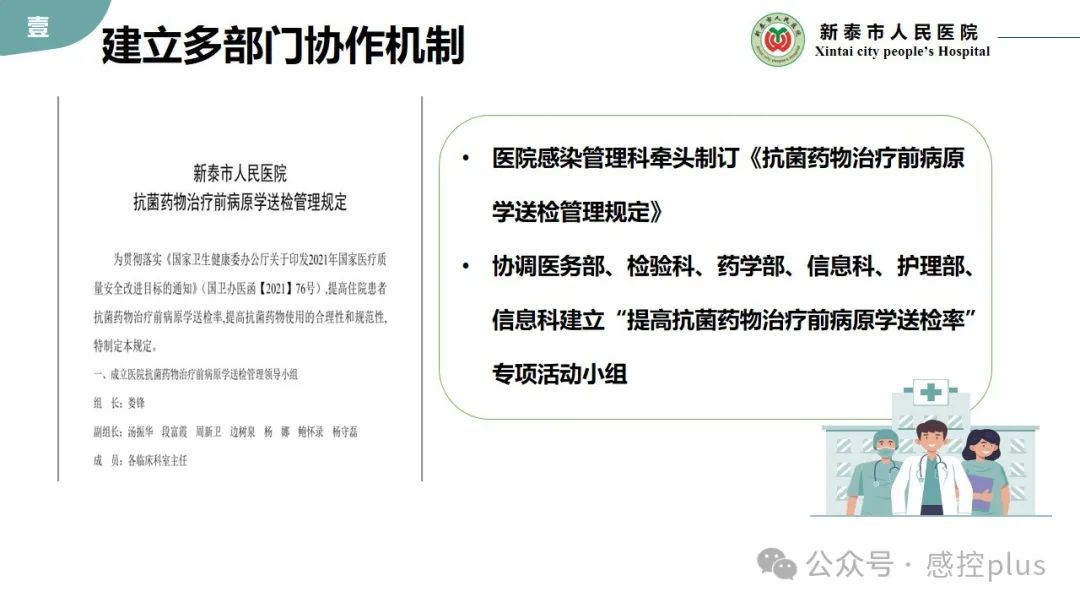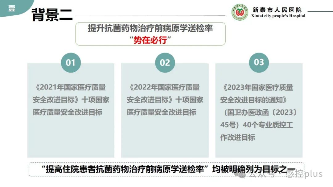 导 读: 抗菌药物治疗前病原学送检率是医院感染管理中的重要指标之一。通过合理提高抗菌药物治疗前病原学送检率,可以有效指导抗菌药物的选择和使用,提高治疗效果,减少细菌耐药性的产生,提高医疗质量和患者安全。PDCA是一种持续质量改进的管理方法,那么,如何将PDCA应用到抗菌药物治疗前病原学送检管理当中,以提高抗菌药物治疗前病原学送检率? 2024年感控plus V讲座第3讲,感控plus特邀山东省新泰市人民医院杨娜老师带来“提高住院患者抗菌药物治疗前病原学送检率PDCA”的主题讲座,希望对各位老师关于抗菌药物的管理能有所帮助和参考。分享讲者PPT: