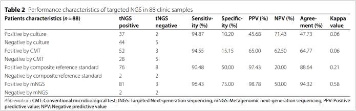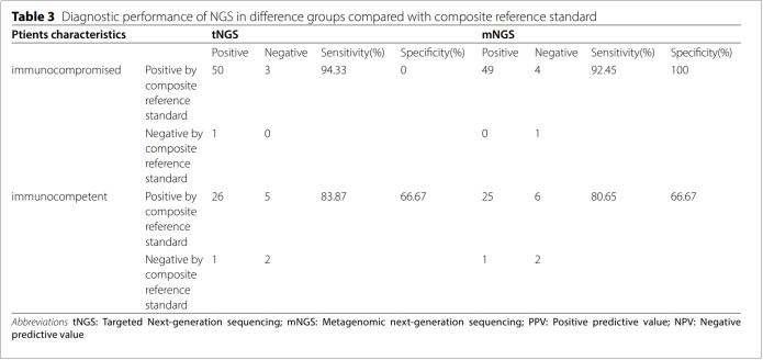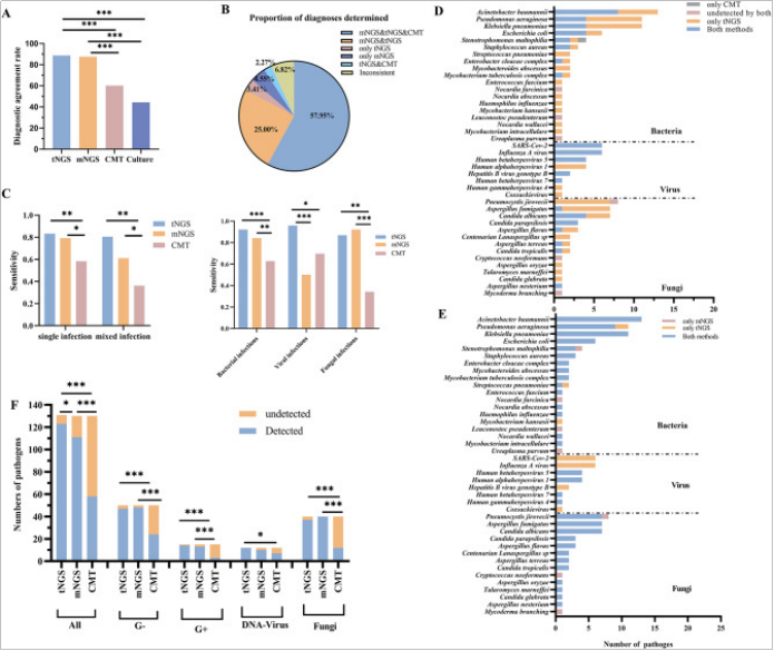 近日,上海交通大学医学院附属仁济医院的李敏教授团队在Annals of Clinical Microbiology and Antimicrobials (JCR分区Q1)发表了关于评估捕获法tNGS在免疫低下的下呼吸道感染患者中临床应用价值的研究成果。该研究基于吉因加探针杂交捕获的 tNGS panel,对下呼吸道感染患者进行了回顾性分析,评估了tNGS与临床诊断的一致性。研究结果证实tNGS技术在辅助临床诊断和提供抗感染治疗指导方面展示了其重要性和潜力。吉因加将携手仁济医院检验科分子诊断平台在未来进一步探索tNGS方法在更多临床场景下的应用潜力和价值,为该技术的广泛应用提供坚实的证据支持。 随着免疫抑制剂使用的增加,越来越多的人出现免疫功能障碍,导至危及生命的事件(尤其是感染)的风险增加,下呼吸道感染(LRTI)是全球免疫功能低下个体死亡的主要原因,由于此类患者感染的病原体的复杂性,可能需要结合各种检测方法, mNGS方法成本高,目前更常用于重症监护病房(ICU)和危重患者。tNGS方法成本效益高,前期研究表明tNGS在鉴定LRTI病原体方面表现出与mNGS相似的敏感性和特异性。因此该研究旨在通过比较tNGS与mNGS和传统的微生物检验(CMT)的性能来评估tNGS在免疫功能低下患者中辅助诊断LRTI的临床表现。 本研究回顾了197位既往就诊于仁济医院的免疫低下的可疑下呼吸道感染患者,最终纳入88名符合研究要求的患者进行分析,所有患者前期都进行了mNGS检测和传统的微生物检验(CMT)。 图1:研究设计 tNGS在所有患者中的诊断价值 首先比较了tNGS与mNGS以及CMT的临床诊断价值。以临床诊断为参考, tNGS和mNGS的诊断敏感性分别为90.48%和88.09%。tNGS与 mNGS的诊断准确性相似(88.64% 和 87.50%),但高于CMT和培养(60.23% 和 44.32%)。无论是单纯感染还是混合感染,tNGS都表现出比CMT更高的诊断一致性。 在病原体检出比较中,tNGS检测出的病原体数目最多,显著多于mNGS。这主要得益于tNGS的DNA和RNA共同检测,而mNGS仅进行了DNA检测。 tNGS不仅额外检出了RNA病毒,而且对SARS-CoV-2和甲型流感的分型结果与PCR结果一致。tNGS展示出显著优于CMT的病原体检测能力,无论是细菌、病毒还是真菌。 图2:tNGS 在 88 个样本中的诊断性能 tNGS在免疫功能低下患者中的诊断价值 在免疫低下患者中,tNGS的敏感性为94.33%,与mNGS的92.45%相当,与整体人群的90.48%相当,无显著差异。另外,与CMT比较,NGS方法的诊断准确率显著更高。 免疫低下和免疫正常患者的病原谱存在差异,细菌感染在免疫正常患者中更常见,而真菌感染在免疫低下患者中发生比例更高。与上述结果相似,tNGS比CMT发现更多的病原体(97.62% vs 44.05%,p<0.0001)。与mNGS相比,tNGS几乎发现mNGS检出的所有病原体,除了在tNGS panel之外的病原体。这也提醒我们tNGS的靶向设计会存在罕见病原体覆盖不全的风险。 图3:tNGS与mNGS 和CMT在免疫低下患者中的诊断比较 NGS 对抗生素调整的临床影响 收集了mNGS对所有的患者的病原学诊断和抗生素决策的影响。mNGS对73.86%患者的抗生素选择和决策产生了正向的影响,17.05% 根据结果进行了抗生素的升阶梯、降阶梯或者停用的调整。通过比较tNGS与mNGS的一致性,可以类比发现,tNGS可以对72.72%的患者产生正向的影响,17.05%根据结果进行适当的抗生素调整。 本研究结果表明,tNGS在免疫功能低下的下呼吸道感染患者中具有病原体诊断的潜力。tNGS的诊断性能与mNGS相当,但成本较低,因此可以作为CMT之外的一种辅助诊断的选择。 |