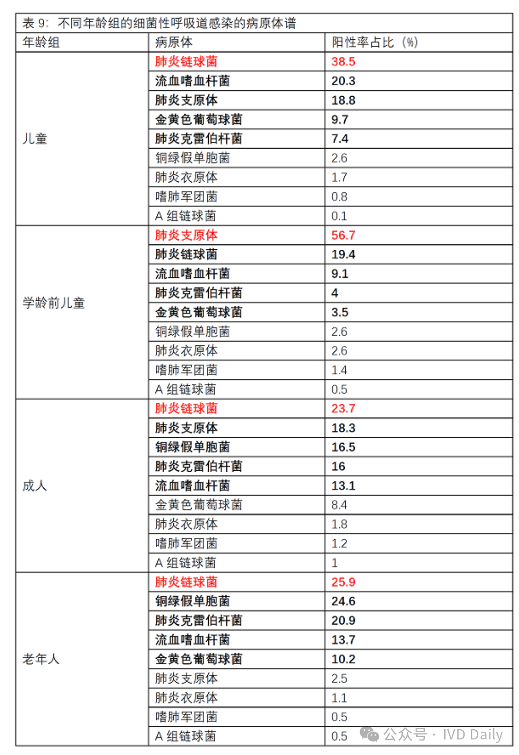 引起儿童急性呼吸道感染的8种病毒中,呼吸道合胞病毒占比最高,鼻病毒、副流感病毒、流感病毒和腺病毒次之。在引起成人急性呼吸道感染的8种病毒中,流感病毒占比最高,鼻病毒、副流感病毒、流感病毒和腺病毒次之。 在引起儿童细菌性呼吸道感染的9种病原体中,肺炎链球菌的占比最高,流血嗜血杆菌、肺炎支原体、金黄色葡萄球菌和肺炎克雷伯杆菌次之。在成人和老年人群体中,肺炎链球菌也是引起的细菌性呼吸道感染占比最高的病原体。而引起学龄前儿童细菌性呼吸道感染的病原体中,肺炎支原体占比最高,高达56.7%。 成年人+儿童呼吸道疾病检测市场规模思路和学龄前儿童检测大同小异! 部分参考:头豹研究院 |
