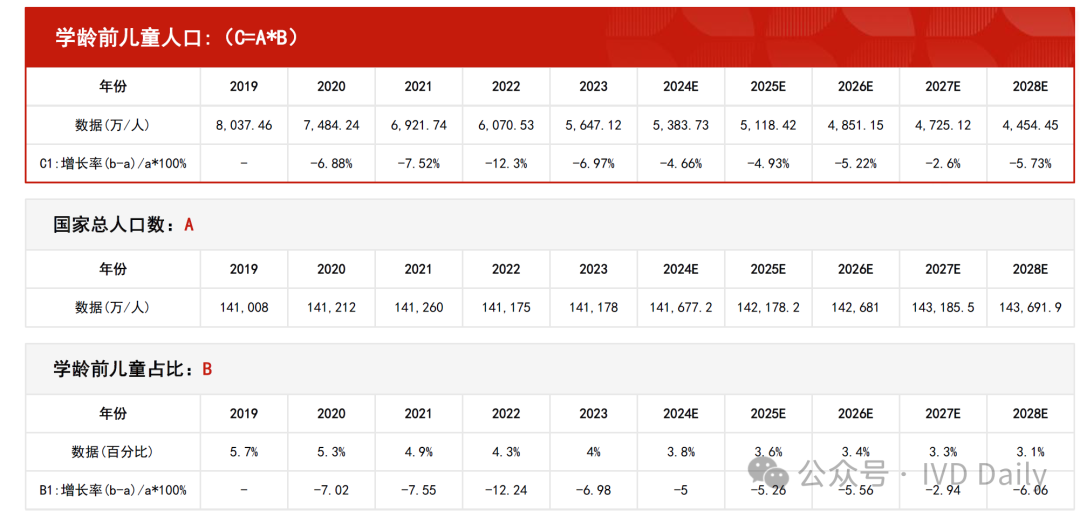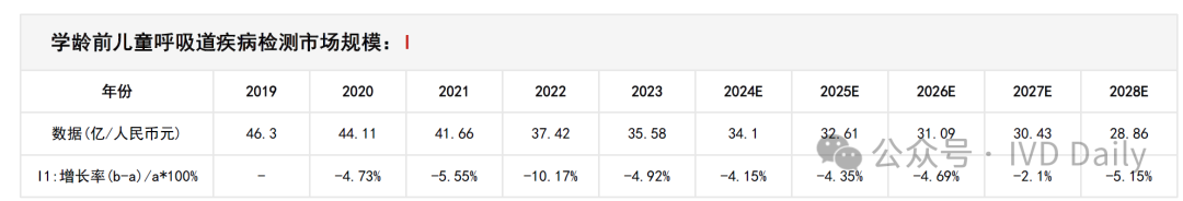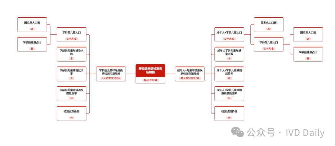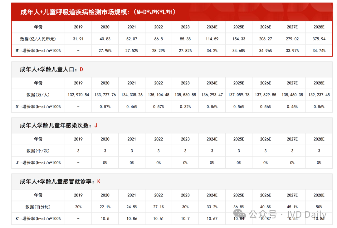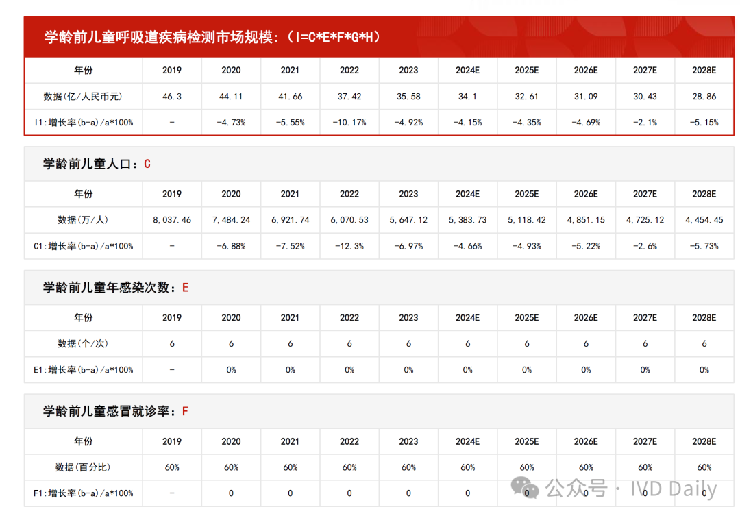 2019年—2023年,呼吸道疾病检测行业市场规模由78.21亿人民币元增长至120.96亿人民币元,期间年复合增长率11.52%。预计2024年—2028年,呼吸道疾病检测行业市场规模由148.69亿人民币元增长至404.81亿人民币元,期间年复合增长率28.45%。 中国是人口大国,呼吸道传染病发病人数在中国常居高位,常见的呼吸道感染以流感等丙类传染病为主。根据国家疾病预防控制局,2023年丙类法定传染病报告发病数达1,567.7万人,同比增长268.0%,其中流感发病数达1,252.8万人,同比增长407.7%。2023年呼吸道疾病高发,有流感、支原体肺炎等多病原体共同传播的影响,且伴随一定季节性,2023年呼吸道感染人数创十年最高。检测是准确用药的前提,呼吸道疾病的爆发将带动检测需求的大幅增长,为检测试剂企业带来大量订单需求。 很多人问小编超百亿的检测产品市场是如何得出的?小编最近学习了某研究院的预测模型,和大家分享下! 先说结论:整个百亿市场测算由两部分组成,分别是学龄前儿童呼吸道疾病检测市场规模和成年人+儿童呼吸道疾病检测市场规模组成。 学龄前儿童呼吸道疾病检测市场规模 学龄前儿童呼吸道疾病检测市场规模由学龄前儿童人口、学龄前儿童感染次数、学龄前儿童感冒就诊率、学龄前儿童呼吸道疾病检测率、检测试剂价格(自测)组成。