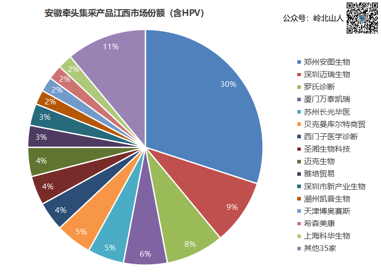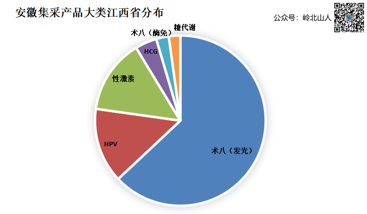 9月20日,江西医保局发布通知,关于做好安徽2023年体外诊断试剂省际联盟集中量采购中选结果执行的通知,同时,将江西省医疗机构的需求量也公布出来。这是安徽发光集采落地实施以来,第一个公布的省份。安徽医保局牵头2023年体外诊断带量采购以来,稳步推进,深得行业的认可。在实施阶段,由于安徽技耗分离收费的配套问题,暂时没有落地,但联盟省份实施进展较快。截至目前,有8个省份明确实施。 根据江西医保局公布的数据,我看可以看出化学发光在江西省的基本情况。安徽牵头的联盟省份,整体市场份额40亿左右(含HPV),江西省报量产品总额为1.6亿(根据中选价格匹配而来),江西市场占联盟省份的4%左右。 化学发光法传染病体量最大,达到1亿金额,占整体市场比例的63%以上;HPV和性激素六项各有2200万,占比14%;糖代谢两项需求量只有350万元,占比2%。 在公司层面,江西市场一共有50个企业有意向采购量(合并关联企业数据),前15家占据89%的市场份额,其余35家只有11%,金额为1722万元。其中占比最高的安图生物,达到30%,金额4868万元,这其中98%来自于传染病,而安图生物的传染病金额(化学发光法),占江西整体市场份额的47%,绝对的市场占有率第一。