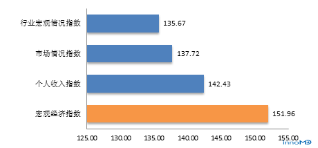 数据来源:中国医疗器械行业协会、医疗器械创新网 虽然各项分指数均比较高,但受访者对宏观经济最为看好 数据显示,受访者对于宏观经济看法最为乐观,信心指数高达151.96,因此人们对于国家未来经济发展非常看好。对个人收入信心指数,市场情况信心指数,行业宏观情况信心指数分别是142.43,137.72,135.67,也比较高,可见人们对于医疗器械行业未来发展充满了信心,以及自己未来收入均表达积极看好态度。