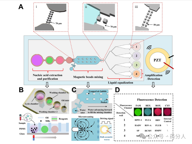 呼吸道病原体对公共卫生构成重大挑战,需要有效的诊断方法。在临床环境中,混合感染的准确诊断具有挑战性,尤其是对于可能同时感染多种病原体的肺炎患者,及时准确的病原体检测不仅是传染病诊断的基础,而且可以指导个性化治疗方案的选择,确保适当使用药物。磁控微流控芯片技术已成为核酸提取和检测的热点,有效解决了传统方法中遇到的与液体转移相关的挑战。该技术有利于提高核酸提取效率,同时减轻气溶胶污染的风险。此外,它将核酸提取、洗涤、洗脱和检测集成到单个芯片中,便于自动化控制。表面张力辅助的不混溶相过滤(IFAST)是设计用于核酸提取的磁控微流控芯片中最常用的技术。该方法利用水相和油相之间的界面处的表面张力,产生有效地分离不同腔室中的试剂而没有干扰的虚拟屏障。由外部磁场引导的磁珠在两相之间快速移动,以促进从样品中提取核酸。这种在微流控芯片中提取核酸的方法已被广泛应用。之后提出了一种利用油浸无损全分析系统(Oil-tas)概念的微流体装置,旨在简化工艺和扩展磁控微流控芯片功能。在该系统中,将液滴固定在充油室中,并且磁珠在液滴之间穿过以进行核酸提取和纯化。这种创新的设备将RNA提取与环介导等温扩增(LAMP)检测无缝结合,证明了在低至10 copies/μL下对SARS-CoV-2病毒的可靠检测。然而,这些策略中的大多数是为检测单一病原体而定制的。目前研究将微流控芯片技术与分子生物学技术如PCR,LAMP和RPA相结合,以实现多重核酸扩增和多病原体检测。但仍存在一些局限性,这些限制包括需要精确控制系统的复杂芯片设计、不能满足早期诊断需求的不足灵敏度以及对昂贵仪器的需求。本文(Simultaneous Detection of Multiple Respiratory Pathogens Using anIntegrated Microfluidic Chip)提出了一种基于集成微流控芯片的PCR策略,用于高效、灵敏地同时检测12种呼吸道病原体。 该芯片集成了四个不同的功能区,可实现基于磁珠的核酸提取和纯化、声流驱动磁珠混合、液体均衡、在四个独立的孔中进行多重PCR扩增,并进行原位荧光检测(如图1A)。通过设计的微柱和气泡捕获阵列结构的组合来实现磁珠的有效混合。微柱在将油包封的水滴系统内的磁珠混合区与核酸纯化区隔离中起着至关重要的作用,从而确保磁珠在水相系统中的有效混合。当腔室充满水相时,气泡捕获阵列结构通过表面张力产生气泡。在由压电换能器(PZT)引起的声场下,这些气泡剧烈振动,从而产生声流。该动态过程充当微混合器,有效地将磁珠混合在水相系统内。在充分混合之后,芯片利用油相将水相驱动到四个相等体积的室中,确保磁珠混合物的均匀分布。在整个研究过程中,最初评估了声流驱动磁珠混合的有效性。随后,通过比较芯片上和芯片外提取的核酸的ct值来验证芯片用于核酸提取的性能。在此之后,研究了芯片在单个芯片内同时定性和定量检测多种病原体的能力。使用12种呼吸道病原体的质粒作为模型进行了证明,包括人副流感病毒1(HPIV-1),甲型流感病毒(FLUA ),人鼻病毒(HRV),人腺病毒(HADV),呼吸道合胞病毒-A (rsv-a),乙型流感病毒(FLUB),肺炎链球菌(SP),人巨细胞病毒 (HCMV),人偏肺病毒(HMPV),肺炎支原体(MP),肺炎衣原体(CP),以及嗜肺军团菌(LP)。最后,该方法成功地用于检测含有单个病原体(rsv-a,SP,HADV,FLUA和MP)的临床鼻拭子样品。以及混合物(rsv-a & SP和HADV & FLUA & MP),证实了这种芯片上测定的实际效用,尤其是其优异的多病原体分析能力,能够准确检测单一病原体和混合感染病原体。此外,该测定也表现出优异的稳定性。与各种基于微流控芯片的分子生物学方法检测多种呼吸道病原体相比,该方法提供了优越的性能,包括10 copies/uL的低检测限,从样品加载到荧光读出约70 min内的快速结果,以及优异的多病原体检测能力。 图1.用于同时检测多种呼吸道病原体的集成微流控芯片。(A) 芯片结构和功能分区的示意图 (i),(ii) 和 (iii) 表示微柱的示意图,显示了它们之间的距离。(B) 核酸提取和纯化区的顶视图和侧视图。(C) 气泡阵列结构的示意图: 蓝色表示双蒸水,从左向右平稳前进以形成气泡。PZT提供声波诱导微流实现有效的混合。(D) 12种病原体 (包括细菌和病毒) 的多重荧光检测的示意图。总结: 本研究展示了一种先进的集成微流体装置,能够在单个芯片上同时检测12种呼吸道病原体。从样品加载到荧光读出的整个工作流程仅需要70分钟。创新的设计具有矩形腔室和具有可变间隙的微柱,有助于有效执行芯片的整个操作过程。另外,油包封的水滴系统的并入有效地减轻了试剂污染的风险,试剂污染是传统管内PCR方法中的常见问题。与各种基于微流控芯片的分子生物学方法相比,该测定表现出相当或优越的灵敏度和速度,使其成为现场同时诊断和监测各种病原体感染的有希望的工具。