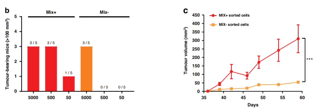 作者下一步分析了MIX+的致瘤性。在15只移植了MIX−细胞的小鼠中,只有3只小鼠发生了肿瘤,而移植了MIX+细胞的15只小鼠中有7只小鼠发生了肿瘤(图b)。与MIX−分选细胞相比,MIX+分选细胞产生更大的肿瘤体积(6倍)。这些结果表明,MIX+细胞的致瘤性高于MIX−细胞,具有干细胞样特征的MIX+细胞将更具侵袭性。