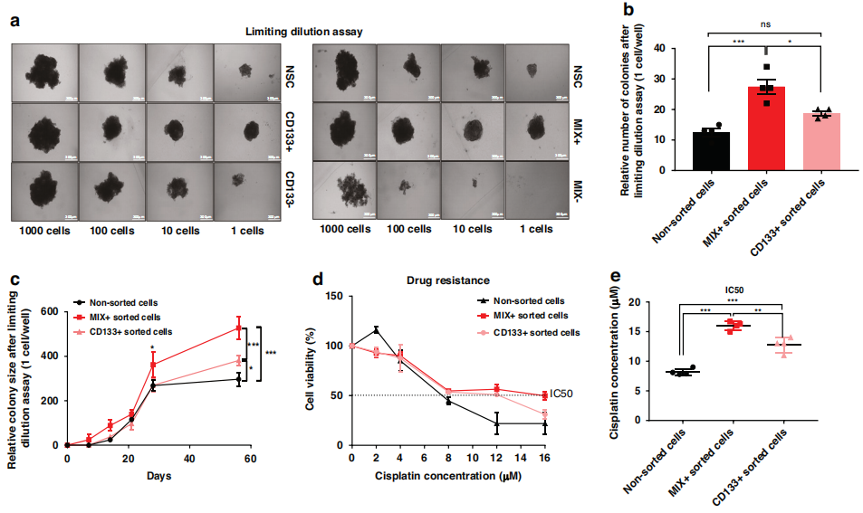 作者比较了A549、H1975和PC9细胞中MIX分选和AC133分选细胞的癌症干细胞样特性。结果显示,与AC133+相比,Mix+组分具有明显更高的自我更新能力(下图a, b),形成的球体尺寸显著增加(下图c)。MIX+细胞比AC133+细胞对顺铂治疗也有更大的耐药性(下图d, e)。这些结果都表明,与基于AC133的分选方法相比,MIX对肺CSCs具有更高的选择性。