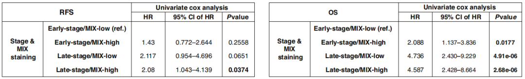 作者下一步评估MIX阳性细胞是否可以预测患者的复发或生存预后。生存曲线和单变量Cox模型对MIX评分OS的预后意义支持较弱。生存曲线显示高MIX染色是早期NSCLC的不良预后因素,但对晚期预后没有帮助。