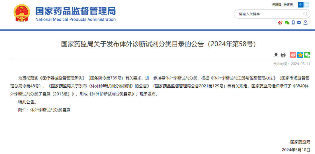 摘要: 2024年5月11日,国家药品监督管理局发布了新版《体外诊断试剂分类目录》,共计1852项产品,其中三类体外诊断试剂331项,二类体外诊断试剂683项,一类体外诊断试剂838项。自2025年1月1日起,原《分类目录》废止。对于 ...