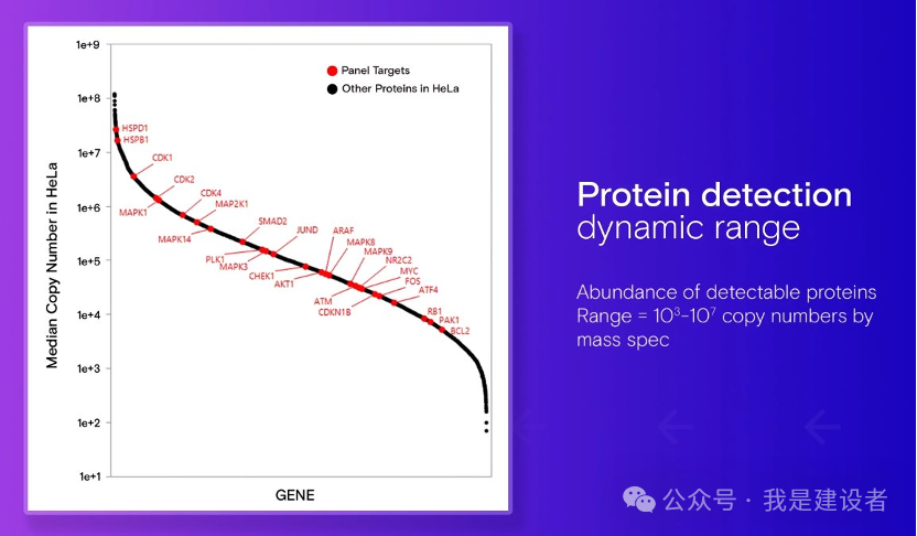 在蛋白检测上,AVITI24与免疫荧光进行了基准测试,两者首先显示了不错的相关性。前面说到,理论上,AVITI24可以提供单个分子的灵敏度,因此应当可以实现高灵敏的蛋白检测。质谱可以实现低至几百个蛋白分子的灵敏度,AVITI24与质谱检测的相关性如何?结果提示,AVITI24可以的确可以检测到不同丰度的较大范围内的蛋白质