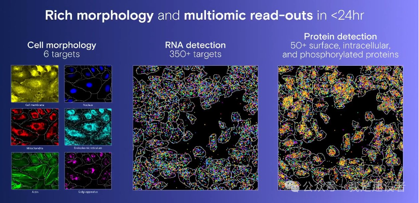 具体来说,今年上市最初上市的AVITI24即可通过6个靶标来分别标记识别细胞核、细胞膜、actin肌动蛋白、内质网、高尔基体和线粒体等特征,使用靶标特异性的小分子偶联寡核苷酸barcode,在结合靶点之后通过ABC测序来实现读出,通过定量检测这些寡核苷酸链上avidite结合的荧光强度进而测定这些细胞结构的的密度及形态等特征。这种cell paint的优势在于它不依赖于光谱的分辨率,而且是可逆的操作,这些标记被冲洗之后不会一直存在于剩余的成像过程中,因此也不会对下游的RNA和蛋白检测造成任何阻碍