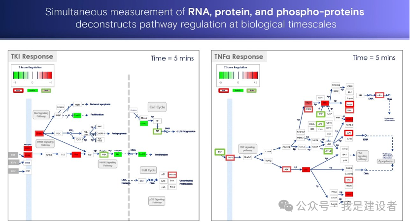 Element团队演示了利用AVITI24的双流通池设置进行药物处理和细胞响应的应用案例。他们分别用TNF-alpha和TKI处理肿瘤细胞,观察在不同时间点这些处理所诱发的细胞形态及这些信号通路上关键RNA及蛋白的变化。结果可以看到一个高度异质化的、剂量依赖的细胞对药物的反应,而这种反应在单细胞水平更是显著不同。通过结合多组学的读出,AVITI24可以帮助更准确地理解这些药物处理的反应,而其中一些反应可能在某些靶标上更明显;也可以帮助在不同细胞状态下(如细胞周期的不同阶段)来探测RNA及蛋白的表达变化水平,甚至可以据此来分配细胞周期的状态。这些提供了一个观察复杂信号通路的窗口,以多组学的视角,提供了单细胞的分辨率和时间维度的动态。试想,只需要不到一个小时的手动操作,你可以在24小时内,在单细胞水平,研究多达200万个细胞的三个组学水平的变化,这是有多么不可思议。