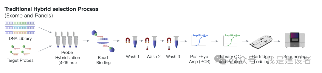 对于基因组测序来说,用户只需要从样本中提取 DNA,进行片段化、末端修复、加A 尾、连接接头后进行测序。而对于外显子组测序,除了所有这些操作,还需要进行杂交捕获,将上面获取文库与捕获磁珠孵育结合,这些磁珠结合了与要捕获的序列互补的寡核苷酸探针。探针杂交反应可能需要 4-16 小时(当然时间越长反应越充分),然后在不同的温度下进行多次冲洗,然后还需要经过PCR扩增这些从磁珠上洗脱的DNA文库,进行QC和混样等步骤,才能进行上机测序。