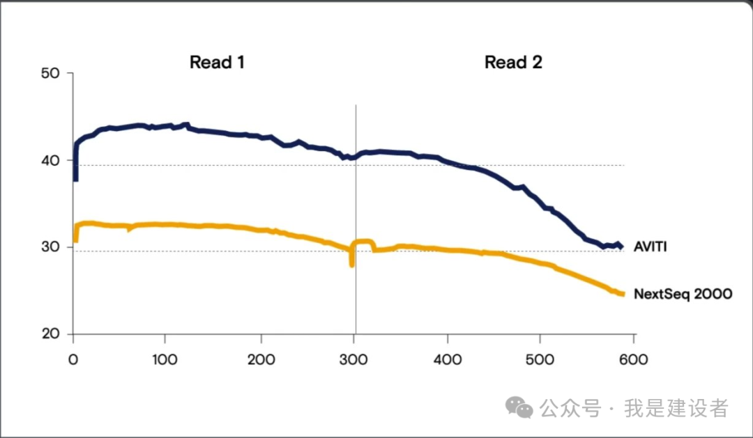 所以,当微生物领域的客户、当免疫研究的客户群体问及更长片段的测序时,Element做了响应,内部孵化并在6个月后推出了PE300的试剂盒。竞争对手的PE300在每个运行特别是第二个300循环的尾端会出现数据质量的大幅下降,而得益于ABC测序化学,Element在2个300循环中都保持了较高的读取质量,这样客户在观测16S宏基因组或者免疫细胞受体序列时会更加自信。