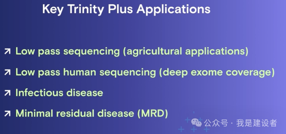 此外,明年Element将推出Trinity plus这个流通池上直接富集的产品。Trinity+的工作流程与 Trinity 略有不同。由于 Trinity 的快速杂交只需 1 小时,因此直接在流动池上进行高特异性捕获似乎能进一步节省的时间有限。Trinity+作为一种富集检测,最适用于增加靶向覆盖,以低覆盖率对完整背景文库进行采样、但需要对探针所针对的位点进行更深覆盖率的实验。Element列举了一些应用,包括low-pass低深度测序进行基因分型,在特定的位点获得更深的覆盖率;包括针对具有高外显子组覆盖率的结构变异进行low-pass WGS 以进行变异识别;包括宏基因组学或传染病测序,如添加使用针对毒力标记、抗生素抗性标记或特定菌株标记的探针;包括肿瘤MRD 或靶向的液体活检等。