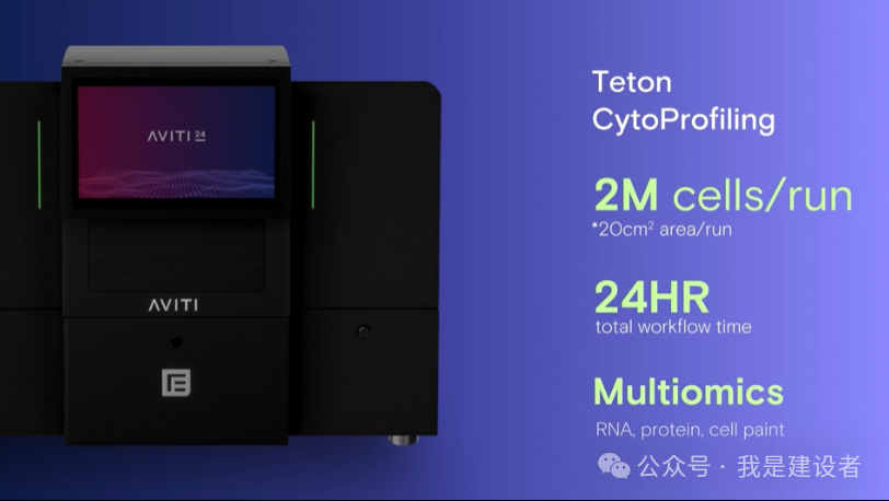 最终AVITI24实现了这一目标,以ABC测序为核心,在测序之外,还可以提供细胞形态、RNA和蛋白等的同时检测,在20平方厘米的承载面积上,每次运行可以分析200万个细胞,并且能在24小时的运行时间完成检测。