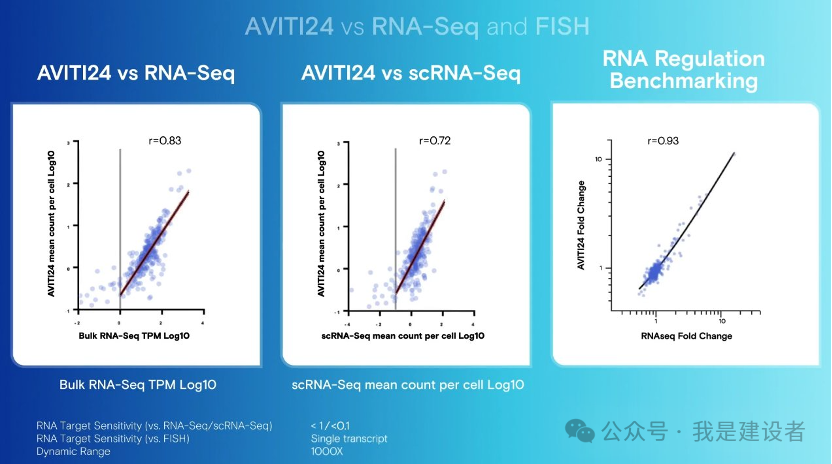 在RNA检测上,AVITI24与RNA-Seq及FISH进行了对比。AVITI24可以实现从低到每个细胞单个转录本到每个细胞上千种转录本的检测灵敏度,这实现了高达1000倍的动态范围,这在这个领域是一个独特的性能参数。在单个细胞水平,可以看到Teton assay和单细胞RNA-Seq的相关性,而低至单转录本水平,FISH和Teton assay也呈现了不错的相关性。