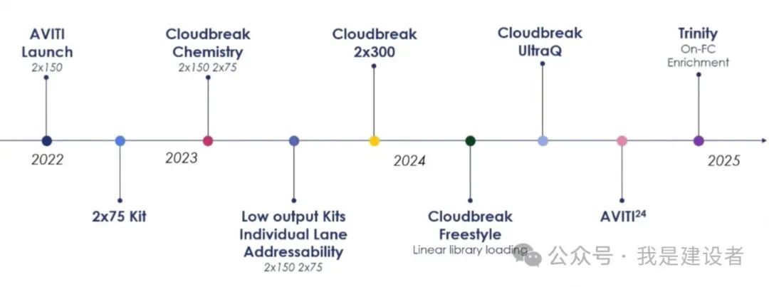 在推出AVITI PE150产品之后一年,Element对其测序生化做了第一次重要升级,推出了Cloudbreak化学,其中一个最显著的效果就是缩短了测序反应的时间,300个循环的测序运行可以减少10个小时。Cloudbreak随之构成了其Avidite Base Chemistry (ABC) 测序化学的核心。