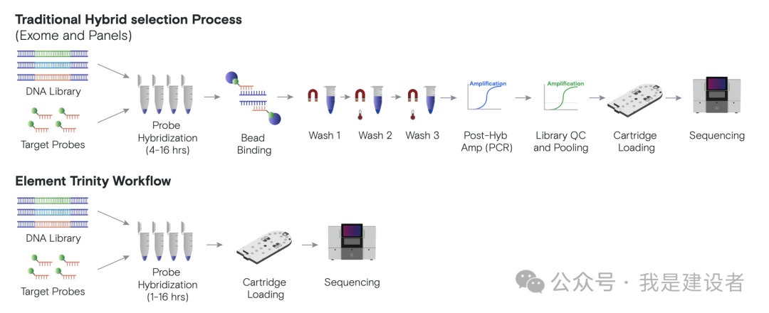 Element重新设计了流通池表面和生化体系来支持Trinity应用。最终,用户只需要将杂交反应液直接加载到流通池上,在杂交步骤之后,就不需要其他手动操作了。Element还引入了超快速的杂交操作流程,使得杂交可以在一个小时内完成。