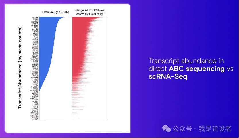 对于非靶向的转录组测序运行,通过对比转录本丰度的分布,表明其与单细胞RNA-seq存在高相关度。然而,在AVITI24上实现这样的单细胞RNA-seq并不需要进行文库制备,而且可以实现更快的周转时间,只需极少的手动操作时间,在一台机器上完成,这大大降低了单细胞RNA-seq的难度。