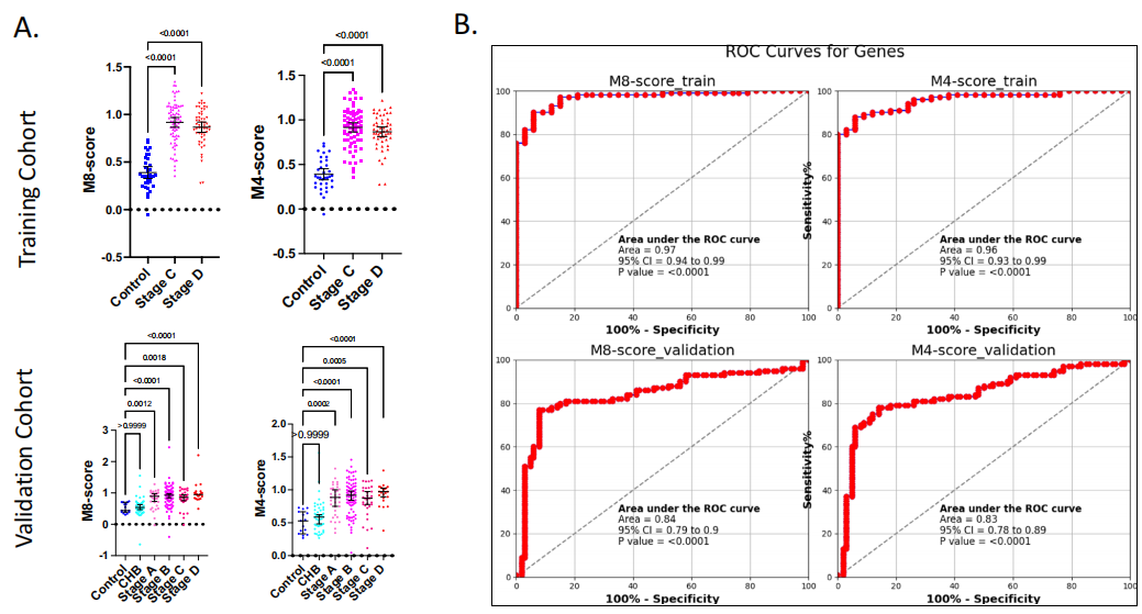 检测循环肿瘤DNA (ctDNA)中癌症特异性DNA甲基化标记物目前被认为是早期检测的首选方法,但该方法存在丰度低和技术复杂性等局限性,这阻碍了其在早期癌症检测中的有效性。外周血单个核细胞(PBMCs)提供了稳定而丰富的DNA来源,可能携带早期HCC的甲基化特征。 近日,杂志communications medicine上发表了一篇题为“Clinical validation of peripheral blood mononuclear cell DNA methylation markers for accurate early detection of hepatocellular carcinoma in Asian patients”的文章。文章表明,将M4评分(基于MAP1LC3B2、NBPF3、RNMTL1P1和STAP1四个基因甲基化水平的评分)与现有的诊断工具(如AFP)相结合,可显著提高早期HCC的诊断敏感性。M4 + AFP在A期的敏感度为88.2%,在所有阶段的敏感度高达95.7%。这些结果强调了PBMC甲基化标志物与当前血清学和血浆标志物结合的潜力,为早期HCC提供了更全面、更有效的诊断方法。 图片来源:communications medicine 主要内容 不同HCC分期基因特异性甲基化谱的比较分析 作者对训练队列中下列基因的中位数甲基化水平进行了受试者操作特征(ROC)分析,以确定每个基因对HCC的鉴别能力:AHNAK 、STAP1 、NBPF3、RNMTL1P1、VMP1、GLRX2、MAP1LC3B2以及cg09435170基因。结果显示,STAP1、RNMTL1P1、GLRX2、NBPF3和MAP1LC3B2在HCC所有阶段都显示出显著差异。VMP1、cg09435170、AHNAK分别在HCC某分期有显著差异 。 在验证队列中,NBPF3在高特异性下,对所有HCC分期中敏感性最高;RNMTL1P1也表现出显著的敏感性,尤其是在早期,但其特异性略低于NBPF3。STAP1、AHNAK和GLRX有高特异性,但在HCC分期中表现出较低的敏感性。其余基因VMP、MAP1LC3B2和cg09435170的特异性和敏感性因HCC分期不同而不同(如下表)。这种基因特异性分析表明,单基因的敏感性是不够的,应该开发一种组合模型。 在验证队列中不同疾病阶段所选基因的性能指标。 图片来源:communications medicine 基因评分的优化以增强HCC分期的区分性能 作者开发了一个HCC早期检测和分期的方法,包括所有8个基因,称为m8评分。结果显示,使用M8评分,对照组与CHB之间无显著差异,而对照组与癌症分期(A期至D期)之间的差异显著,且随着癌症分期的进展,显著性水平的增加(下图A、B)。 作者将M8中的四个重要分类因子(NBPF3、RNMTL1P1、MAP1LC3B2和STAP1)来创建M4评分,并比较了M8和M4评分的表现,并建立100%特异性和最高灵敏度的阈值(图B)。结果显示,在验证队列中,M8和M4评分在对照组中均表现出100%特异性,且M4评分普遍优于M8。 甲基化评分的ROC分析。 图片来源:communications medicine AFP及其与epiLiver、M8和M4评分的整合 作者评估了PBMC M4和M8评分和AFP与epiLiver的联用,是否提高了HCC检测的敏感性。总体而言,PBMC M评分与epiLiver和AFP的联用显著提高了所有HCC分期的敏感性,同时保持了高特异性,特别是在CHB患者中。在各种组合中,M4-epiLiver+AFP和M8-epiLiver+AFP在HCC晚期表现出最高的敏感性,M4 +AFP在早期高度敏感(如下表)。总的来说,将M4或M8评分与epiLiver和AFP标志物或两者结合,可显著提高HCC的诊断,提高疾病早期和HCC所有阶段的检测能力。 M评分和M-ctDNA综合评分的性能指标。 图片来源:communications medicine M4和M8评分在HCC 与乳腺癌和前列腺癌比较中的特异性 为了验证M4和M8评分检测HCC的特异性,作者将M4和M8评分应用于来自前列腺癌和乳腺癌患者的PBMC的DNA甲基化数据。结果表明,虽然AHNAK、STAP1和cg09435170位点在乳腺癌(BrCa)和对照组之间显示出显著的甲基化差异,但差异不明显。其他检查的位点没有达到统计学意义。前列腺癌中的AHNAK、STAP1、RNMTL1P1、VMP1和MAP1LC3B2,在与健康对照个体比较时,没有发现统计学意义。 总结与讨论 作者评估了PBMC衍生的甲基化标志物在HCC中的诊断潜力。M8和M4评分与epiLiver和AFP的结合可显著提高早期HCC的诊断敏感性。M4+epiLiver评分在A期HCC的敏感性为79.4%,而M4联合AFP在所有阶段的敏感性提高到88.2-95.7%。结果突出了结合cfDNA甲基化和PBMC DNA甲基化的诊断优势。通过对每个生物标志物集保持100%的高特异性阈值,确保诊断方法的稳健性和可靠性的同时提高了灵敏度。 使用白细胞而非cfDNA的明显优势在于,血浆中(cfDNA)极其稀缺,量化白细胞DNA中DNA甲基化面临更低的技术挑战。研究的局限性在于参与者的数量相对较少,可能会影响结果的准确性和可靠性。此外,组间的年龄差异以及该研究仅在孟加拉国进行,可能会限制对其他人群的适用性。在更大的异质队列中对已确定的甲基化标记进行更广泛的验证是必要的。 |