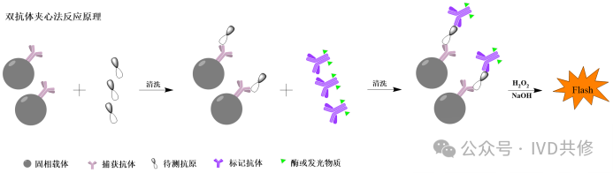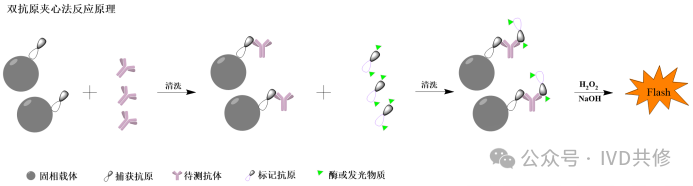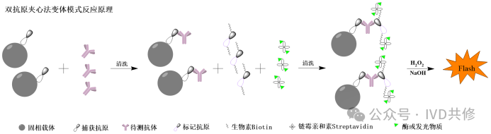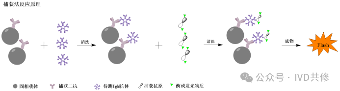 双抗体夹心法:样本中的待测抗原与固相载体上的捕获抗体反应形成”固相载体-捕获抗体-待测抗原“复合物,清洗后,再加入标记抗体,形成”固相载体-捕获抗体-待测抗原-标记抗体“双抗体夹心复合物,检测信号与样本中待测抗原的量成正相关。反应原理如下图:双抗原夹心法:样本中的待测抗体与固相载体上的捕获抗原反应形成”固相载体-捕获抗原-待测抗体“复合物,清洗后,再加入标记抗原,形成”固相载体-捕获抗原-待测抗体-标记抗原“双抗原夹心复合物,检测信号与样本中待测抗体的量成正相关。反应原理如下图:由于夹心法需要对抗体或抗原进行标记,抗体用酶或者发光物质标记后一般情况下不会影响稳定性,但是抗原用酶或发光物质标记后容易导至构象变化导至稳定性下降,因此夹心法也有变体模式,主要体现在标记端,反应原理如下:双抗体夹心法:需要待测抗原的抗原决定簇数量≥2个,抗原决定簇一般由四到八个氨基酸残基组成,一个氨基酸的平均分子量为110Da,因此待测抗原的最小分子量为880Da,但是实际情况下由于空间位阻原因,因此待测抗原的分子量要远远大于880Da。笔者目前遇到的最小待测抗原约为2kd(个人观点,仅供参考)。双抗原夹心法:由于待测抗体为同型二价抗体,因此捕获抗原和标记抗原需要含有共同的抗原决定簇。如果在原料搭配时,发现没有信号,有一种可能性就是捕获抗原和标记抗原缺乏共同的抗原决定簇(个人观点,仅供参考)。优点:(1)两种抗体均为特异性结合,灵敏度高;(2)由于使用了两种不同的抗体,夹心法可以降低非特异性结合,特异性好;(3)夹心法信号值和浓度值的比例关系很好,因此曲线宽、线性好;(4)同时反应原理简单,易于操作。缺点:(1)易受RF、异嗜性抗体、人抗动物抗体等干扰物质的影响,需要加入阻断剂或者对原料进行改造,成本高。(2)使用夹心法检测抗体时,检测的是样本中的总抗体,无法对抗体的种类进行区分(该点有时也是优点)。(3)抗原进行标记时容易改变构象,引起沉淀或者稳定性下降。总之,夹心法是一种高灵敏度和高特异性的免疫检测方法,适用于多种生物样本的分析。然而,其成功与否依赖于抗体的质量和选择,且在某些情况下可能受到样本中其他成分的干扰。因此,在实际应用中,需要综合考虑其优缺点,选择合适的检测方法。 间接法检测IgG:样本中的待测抗体与固相载体上的捕获抗原反应形成”固相载体-捕获抗原-待测抗体“复合物,清洗后,再加入标记二抗,形成”固相载体-捕获抗原-待测抗体-标记二抗“复合物,检测信号与样本中待测抗体的量成正相关。反应原理如下图:间接法:需要区分抗体的类别,特别是检测样本中的IgG型抗体时,一般首选间接法(标记二抗选择抗人IgG抗体);有时也使用间接法检测IgM型抗体(标记二抗选择抗人IgM抗体)。使用间接法检测IgG型抗体时,需要考虑IgM型抗体的干扰,因此需要筛选对IgM型抗体交叉反应小的二抗(抗人IgG抗体)。使用间接法检测IgM型抗体时,需要考虑在体系中增加去除IgG型抗体的措施(比如添加IgG去除试剂等)。PS:二抗通常是指用于识别和结合一抗(Primary Antibody)的抗体。优点:(1)灵敏度高,通过二抗与一抗的结合,可以实现信号的放大,提高检测的灵敏度。(2)灵活度高,二抗作为标记物可以多个项目共用,且成本较低。(3)间接法的基本原理相对简单,通常只需使用一个抗原和一个通用二抗。这种简化的体系使得实验设计和操作更为直观,降低了实验的复杂性。缺点:(1)一般特异性较差,主要是由于固相载体如果吸附了抗体,则必然会导至假阳性,因此使用间接法时,需要重点优化固相。(2)可能的交叉反应,如果二抗不够特异,可能会导至交叉反应,从而影响结果的准确性。总之,间接法是一种灵活且有效的免疫检测方法,广泛应用于临床和研究领域。尽管存在一些缺点,但通过适当的实验设计和优化,间接法仍然是许多免疫检测中的首选方法。免疫测定原理-捕获法捕获法检测IgM抗体:样本中的待测抗体与固相载体上的捕获二抗(抗人IgM,抗μ链)反应形成”固相载体-捕获二抗-待测抗体“复合物,清洗后,再加入标记抗原,形成”固相载体-捕获二抗-待测抗体-标记抗原“复合物,检测信号与样本中待测抗体的量成正相关。反应原理如下图:捕获法:主要用于IgM型抗体或者IgA型抗体的检测(为了避免样本中IgG型抗体的干扰)。IgM型抗体主要在感染的早期产生,因此适用于传染性疾病(病毒性感染)的早期诊断。优点:(1)特异性好,检测IgM型抗体时一般需要稀释,可以降低干扰物质的浓度。(2)灵敏度高,捕获法能够检测到低浓度的IgM抗体,主要是由于IgM的效价高,只要捕获到一分子的IgM就结合多个抗原产生信号(理论上IgM型抗体为10价)。(3)捕获法的基本原理相对简单,固相载体可以共用,可以降低实验的复杂性,并且成本较低。缺点:(1)需要对抗原进行标记,需要摸索最优条件以降低标记对抗原的影响。(2)需要稀释,导至检测时间较长。(3)容易受IgG抗体的影响。(4)捕获法的测量范围较窄,且稀释不呈线性。总之,捕获法检测IgM抗体具有高特异性和灵敏度,适合早期感染的诊断,但也面临需要对抗原进行标记、检测时间长和信号干扰等挑战。在实际应用中,需要综合考虑这些优缺点,以选择合适的检测方法。