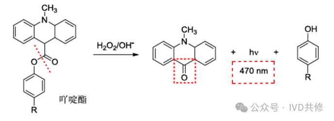 直接化学发光法的特点为示踪物直接标记在抗体、抗原、配体或受体上。标记物中的示踪物不需要酶的催化作用,在碱性条件下直接发光。目前最常见的直接化学发光示踪物主要有吖啶酯和异鲁米诺(ABEI)。具体发光原理为:在碱性H2O2溶液中,吖啶酯分子受到过氧化氢离子的攻击时,吖啶环上的取代基与C-9和H2O2形成不稳定的二氧乙烷,随后二氧乙烷分解为CO2和电子激发态的N-甲基吖啶酮。在含有H2O2的稀碱性溶液中,吖啶酯或吖啶磺酰胺类化合物能够发光,无需催化剂,且发光系统简便。这类化合物的发光特性为闪光型,加入发光启动试剂后约0.4秒内光强达到最大,半衰期约为0.9秒,极为高效。吖啶酯发光波长为470nm。反应快速,检测时间短。为了增强吖啶酯或吖啶磺酰胺类化合物的化学发光强度,常在发光启动试剂中添加Triton X-100、CTAC、Tween-20等表面活性剂。直接化学发光法示踪物为化学合成,成本较低;在无示踪物的情况下,底物不能单独发光,因此本底较低;示踪物分子量较小,空间位阻较小,标记量适度提升。(个人观点,仅供参考)