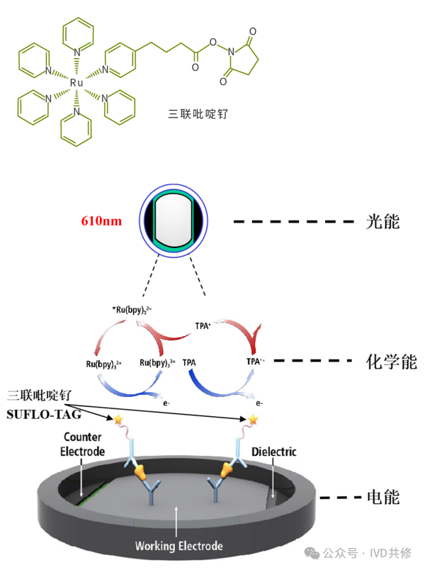 电化学发光法是将电化学发光剂三联吡啶钌[Ru(bpy)3]2+标记抗原、抗体、配体或受体。当在电极上施加一定的电压或电流时,电极上的电化学发光剂三联吡啶钌[Ru(bpy)3]2+与电子供体三丙胺(TPA)发生化学反应,产生激发态。激发态返回基态时释放能量,发光波长为610nm左右。电极表面的电化学反应和化学发光过程可以循环进行。可以通过增加循环次数放大信号,检测灵敏度大大提高,故电化学发光检测具有高灵敏度的特点。(个人观点,仅供参考)