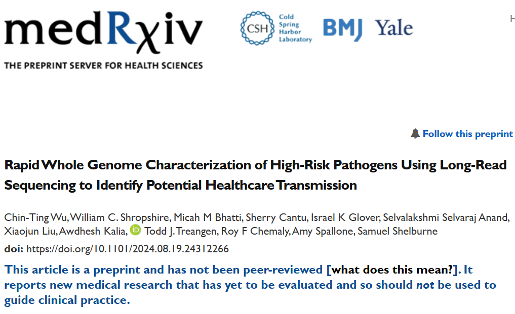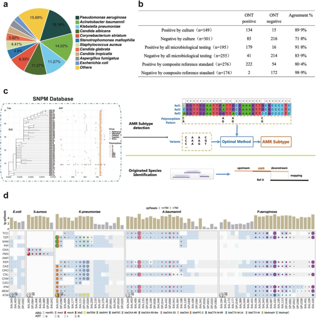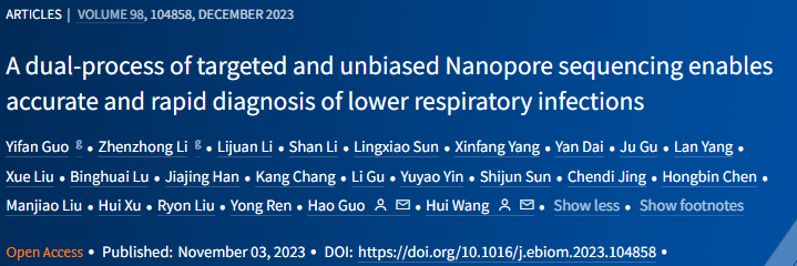 细菌和病毒 ROC 曲线分析 文献二 靶向和无偏宏基因组结合的双流程纳米孔测序技术能够快速准确诊断下呼吸道感染 作者: Yifan Guo, Zhenzhong Li, Lijuan Li,. et al. DOI:https://doi.org/10.1016/j.ebiom.2023.104858 解读 纳米孔宏基因组学已被用于细菌病原体的感染疾病诊断。然而,这项技术目前在临床环境中对细菌、真菌、和病毒的检出性能尚缺乏全面的研究。 研究团队开发了一种用于单样本的双流程纳米孔测序技术,该技术在宏流程中进行无偏好的宏基因组学研究,在靶向流程中进行靶向富集(纳米孔Meta-Panel流程,NanoMP),并前瞻性地从多中心收集了450例下呼吸道标本。基于21种物种的正交实验,通过机器学习和ROC曲线建立的过滤体系提高对病原检测的准确性。 流程示意图 在这项前瞻性大队列研究中,研究团队使用了450例临床呼吸道样本来评估纳米孔测序检测感染病原体的性能,建立了一种Dual-barcode的涵盖DNA/RNA病原体检测的NanoMP方法。利用机器学习和ROC曲线建立可用于临床样本的病原检测过滤体系并有望扩展到其他研究中。同时根据临床结果,也评估了基于SNPM数据库建立的AMR基因检测方法的临床检测性能。本次通过涵盖细菌、真菌和病毒以及AMR基因检测的多中心、大队列临床研究,和建立的病原水平的方法学性能评价和样本水平的临床性能评价的两级性能评价体系,更能反应出纳米孔测序的真实临床应用表现。 基于临床判断的纳米孔测序病原体检测和AMR基因鉴定的性能 文献三 纳米孔测序在病原微生物检测中的应用专家共识 作者: 张述耀,侯铁英,黎小妍,钟诗龙,伍俊妍,黄彬 DOI:https://doi.org/10.1016/j.ebiom.2023.104858 解读 感染性疾病是由病原微生物引起的疾病的统称,目前仍然是全球公共卫生的重大威胁。实现病原微生物的快速精准检测对于感染性疾病的诊治具有非常重要的临床价值。 随着基因组学技术的发展,高通量测序技术为病原微生物的鉴定提供了新的技术手段。该技术通过对样本核酸序列的测定可以实现传染病病原微生物的快速准确鉴定,而且检测通量高、耗时短,正越来越多地应用于临床感染性疾病的诊断和疫情防控之中。 目前,高通量测序技术(也称“新一代测序技术”),泛指第二代测序技术(next generation sequencing technique,NGS)和第三代测序技术(third-generation sequencing technique,TGS)。其中,NGS测序通量高,但其测序读长较短,导至后续在进行生物信息学分析时基因组拼接困难,且测序时存在高GC偏好性,上述缺点使其应用受限,也因此推动了TGS的发展。TGS因其超长的测序读长弥补了NGS的不足,逐渐被应用于临床各个领域。 依据检测目的和方法的不同,TGS主要分为靶向测序(targeted next generation sequencing,tNGS)、宏基因组测序(metagenomics next generation sequencing,mNGS)和全基因组测序(whole genome sequencing,WGS)等方向;依据测序原理的不同,则可分为纳米孔电信号测序[以纳米孔单分子测序(以下简称“纳米孔测序”)为代表]和单分子荧光信号测序[以单分子实时测序(single molecule realtime,SMRT)技术为代表]。 其中,纳米孔测序具有设备小型化、便携的特点,可以在床旁、野外开展样本检测,符合临床上即时检测的需求,可缩短临床病原微生物的诊断时间,改善抗生素滥用问题。近年来纳米孔测序已经在病原微生物检测、感染性疾病甚至重大公共卫生问题流行期间的诊断与防治等领域发挥了重要作用,也有多项基于纳米孔测序病原微生物检测的多中心研究开展,由此可见,纳米孔测序在临床病原微生物检测领域具有独特的优势及广阔的应用前景。 文献四 通过实时基因组学检测隐藏的抗生素耐药性 作者: Themoula Charalampous, Gemma L. Kay, Hollian Richardson, Justin O’Grady DOI:https://doi.org/10.1038/s41587-019-0156-5 解读 耐药性感染由于治疗延迟或不适当而导至更高的死亡率和发病率,快速准确地识别耐药细菌病原体可以促进早期给予适当的治疗,降低死亡率和感染和治疗相关的发病率。 基于纳米孔测序长读长的优势可以用来创建高度精确的、接近完整的基因组组装,用于菌株水平的鉴定和细菌病原体及其抗生素耐药性的从头检测。尤其复杂感染情况下,快速准确的靶向治疗可能对患者的预后特别有益,纳米孔测序技术提供了在临床环境中直接加速病原体鉴定和抗生素耐药性分析的潜力。 作者针对一例多重耐药性肺炎克雷伯菌的病例利用纳米孔测序技术开展的实时基因组学研究,验证了该技术能显著增强对抗生素耐药性检测的能力,能够揭示传统检测手段可能遗漏的耐药机制,加快临床决策的制定,进而提升患者的治疗效果。 该感染病例的病程和治疗方法概述 纳米孔测序在治疗前分离株中检测到传统诊断方法遗漏的低丰度质粒介导的耐药基因 blaKPC-14 抗性基因的单个拷贝,它解释了本病例研究中对头孢他啶-阿维巴坦的耐药性,同时可能恢复体外碳青霉烯类敏感性。 治疗前后分离株的基因组和质粒从头组装 因此,基于基因组学的耐药预测不仅与传统诊断确定的耐药模式一致,而且还确定了blaKPC-14 是假定的耐药机制(见下表) 实时基因组学诊断结果 纳米孔测序可在1.5小时内提供初始数据,比传统方法所需的52小时快得多,便于及时干预。通过纳米孔选择性测序进行抗生素耐药性分析具有快速和原位分析的特性,针对性地选择最合适的药物和治疗方法,从而提升患者的治疗体验和生活质量。 此研究展示了经