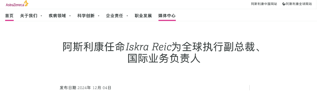 阿斯利康任命Iskra Reic为全球执行副总裁、国际业务负责人,全面负责包括中国、亚洲和欧亚市场、中东和非洲、拉丁美洲、澳大利亚和新西兰在内的地区整体战略。