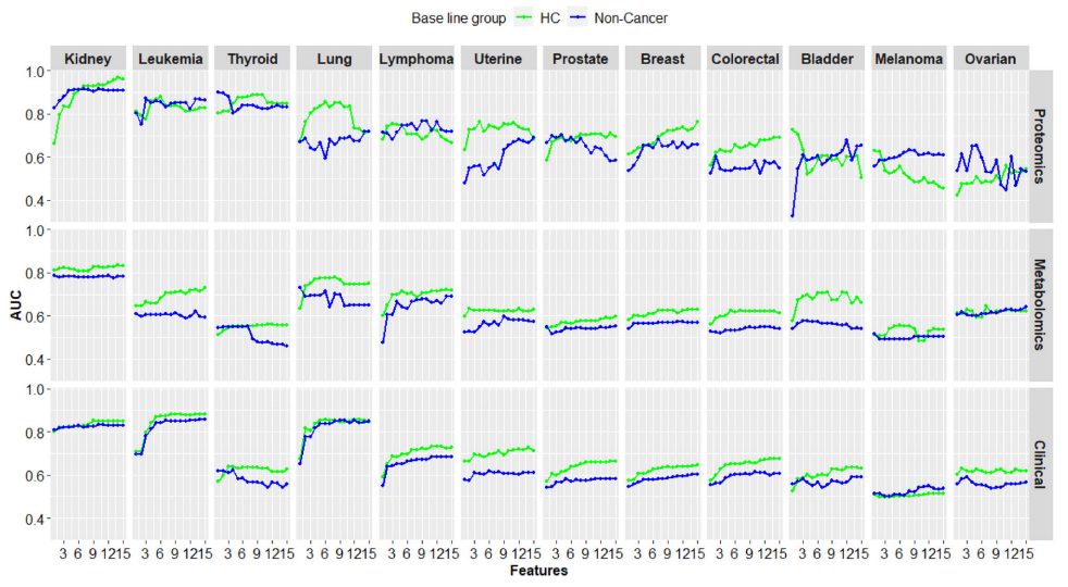使用机器学习分析来自多组学和临床数据的潜在生物标志物的表现。结果发现癌症患者与健康对照的比较在蛋白质组学、临床变量和基因组学方面产生了相似的AUC (分别为0.75、0.74和0.72)。相比之下,代谢组学最高的AUC仅为0.64。纳入更多特征,AUC仅有略微改善(下图A)。当将癌症患者与非癌症患者进行比较时,基因组学、临床变量和代谢组学的AUC均下降(分别为0.74至0.56、0.72至0.51和0.64至0.54)。