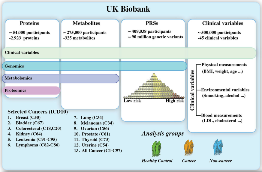 近日,杂志Communications medicine上发表了一篇题为“Multiomics biomarkers were not superior to clinical variables for pan-cancer screening”的文章。作者利用来自英国生物银行50万参与者的多组学数据,测试基于多组学数据的外周血生物标志物是否可以改善癌症筛查。结果表明,蛋白质组学、代谢组学或基因组生物标志物未显示出优于泛癌症筛查的临床变量,但对于一些高度血管化器官的癌症如肾脏和甲状腺,观察到有希望的结果,AUC大于0.8,可能在临床上有用。