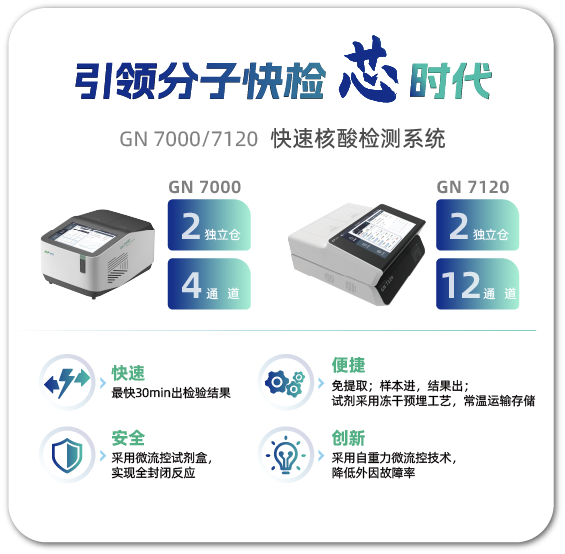 对于患者而言 联合检测通过对多个常见病原体的覆盖,提高了检测阳性率,缩短康复流程,减少就诊时间,有助于提高疗效和就诊体验; 对于医护人员而言 相比与多个独立的单检产品,联检产品统一了所有标靶的反应体系,一次操作即可得到多个检测结果,大大简化了操作程序; 对于医院而言 相比与多个独立的单检产品,联检产品的采购和管理成本均有所降低。 呼吸道检测多种方法学对比 (1)快速抗原检测(胶体金) (2)血清学检测 (3)病毒培养 环境要求高,必须在PCR实验室内完成; 操作繁琐,要经过提取、样本转移和试剂调配; 检测时间长,一般需要一两个小时; 仪器试剂耗材成本高。 场地不受限,无需PCR实验室; 操作简单,样本进,结果出,过程全集成; 检测时间短,GN 7000 30min完成全检测流程; 节约资源,节省耗材,解放人力 综上,分子POCT有利于快速准确确定致病原,更好地服务于临床! 医疗新突破,新一代呼吸道检测技术 呼吸道病原体三联检测方案 基蛋生物甲型流感病毒、乙型流感病毒、呼吸道合胞病毒三联检,引领咽拭子样本全封闭自动化检测! 优势:移动的PCR实验室——让精准检测惠及更多检测机构,真正做到多场景应用。 更安全——真正的全封闭反应,防止样本转移过程中的病毒外泄。 操作简便——样本进,结果出,无需样本转移,添加试剂。 自重力微流控技术 国内首家采用自重力微流控试芯片剂盒; 预埋干粉球试剂,储存和运输常温即可,试剂稳定性更好; 全封闭反应; 样本特殊纯化工艺; 试剂盒采用高分子材料注塑制造,保证液体流通性更好 |