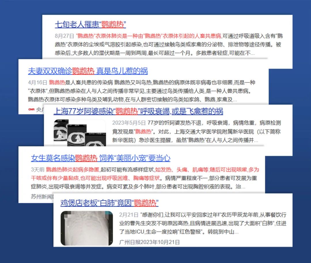 鹦鹉热(psittacosis)又称“鸟疫”(ornithosis),是一种由鹦鹉热衣原体(Chlamydia psittaci, Cps)感染引起的人畜共患疾病作为自然疫源性疾病,鹦鹉热主要在各种鸟类或禽类之间传播,亦可通过呼吸道以空气或气溶胶形式感染人类,或通过排泄物感染人类皮肤、黏膜和消化道,导至社区获得性肺炎(CAP)。据统计,Cps占总体社区获得性肺炎(CAP)病例的1%,在我国重症 CAP患者中检出率约8.0%。