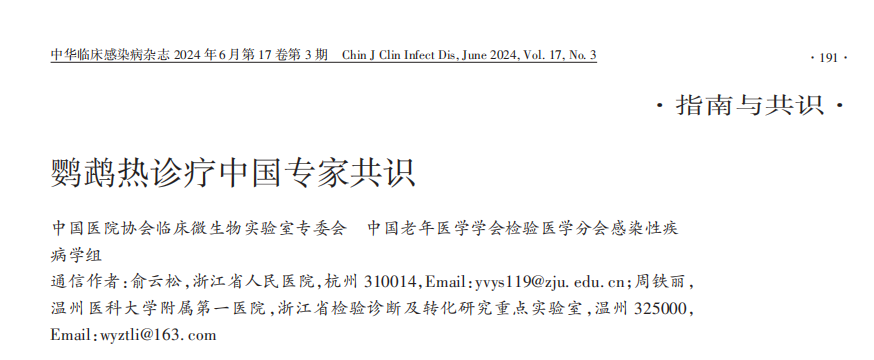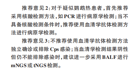 对于疑似鹦鹉热患者,首先推荐采用核酸检测方法,如PCR进行病原学检测;当不具备核酸检测条件时,推荐使用血清学抗体检测方法进行病原学检测。