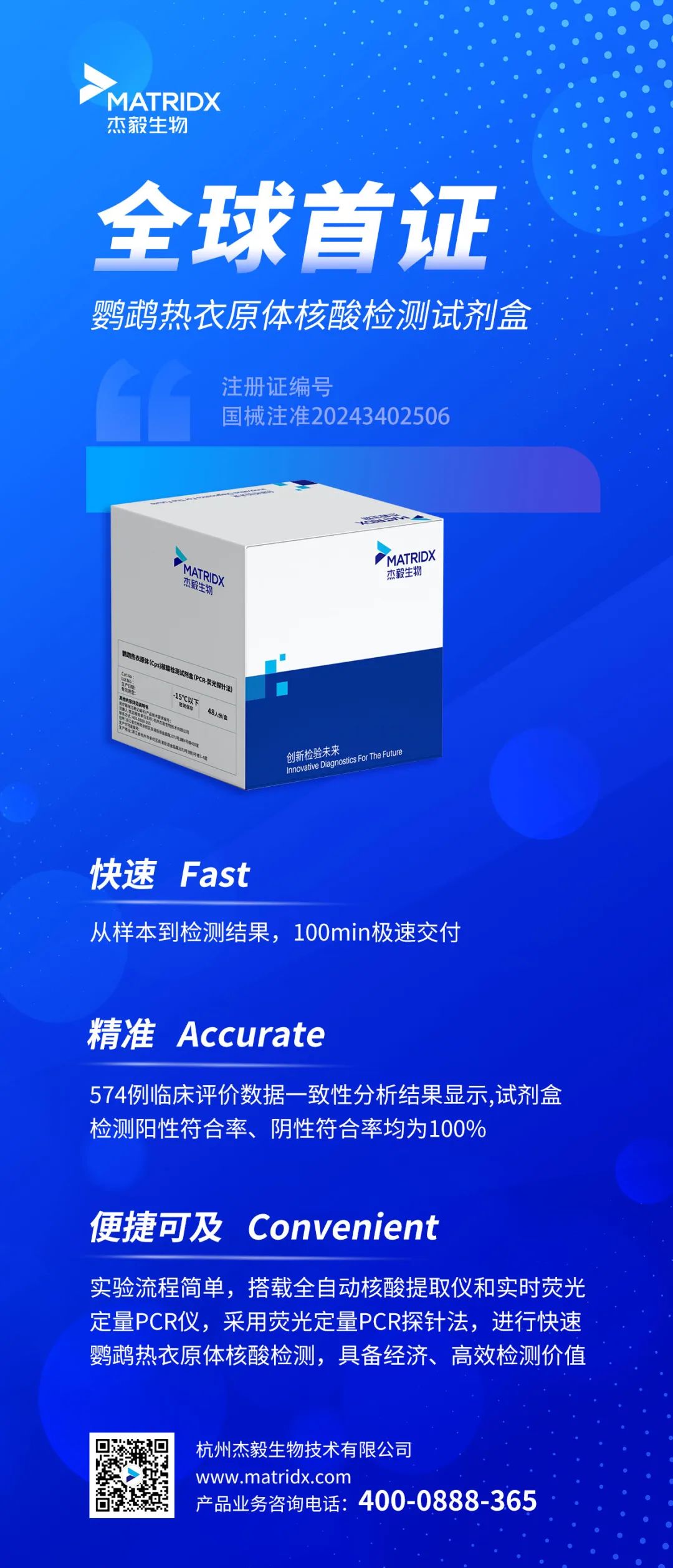 最新消息,杰毅生物自主研发的鹦鹉热衣原体(Cps)核酸检测试剂盒(PCR-荧光探针法)通过国家药监局审核正式获批中国医疗器械注册证!注册证编号:国械注准20243402506。