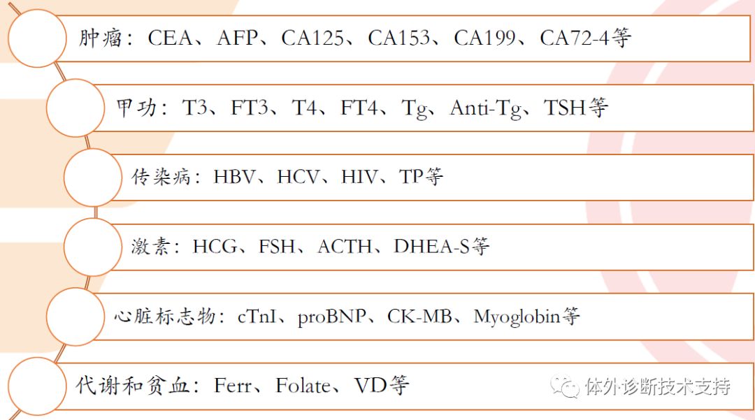 国内外主流的试剂技术类似,主流有直接化学发光(异鲁米诺(新产业)、吖啶酯(雅培)、间接(酶促)化学发光(丹纳赫、迈瑞、安图)、电化学(罗氏),各有优劣势,暂无明显技术替代的趋势,但是电化学发光被认为是第三代技术,技术上略略领先。 试剂的性能包括准确度、灵敏度、线性范围、抗干扰能力、存储稳定性、开瓶稳定性、试剂盒规格等;机器的性能包含检测速度、试剂位、样本位、仪器大小等,准确度是核心,通过与已获证产品的对比得到;其他性能间接影响准确度,需要结合具体项目标准、厂家性能以及客户需求综合评价。迈瑞医疗(300760.SZ)由于其在品牌、技术积累、研发投入及市场能力的优势被广泛看好。 化学发光临床广泛应用于临床。化学发光是免疫诊断的一种,是利用抗原抗体之间的特异性反应来测定体内疾病标志物浓度,从而判断人体身体状态的诊断方法,广泛应用于传染病、心脏疾病、肿瘤、妊娠检测等。 免疫检测标志物超过100个。免疫检测标志物统计超过100个,按照免疫反应中的角色,标志物可以分为抗体与抗原,其中抗原又包括大分子抗原与小分子抗原。
