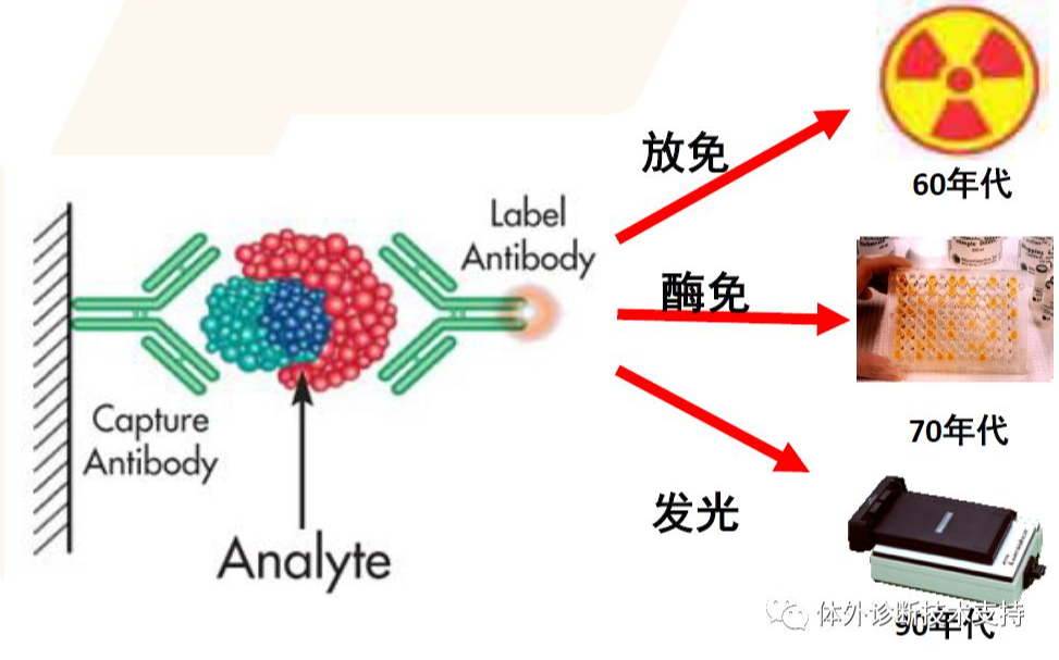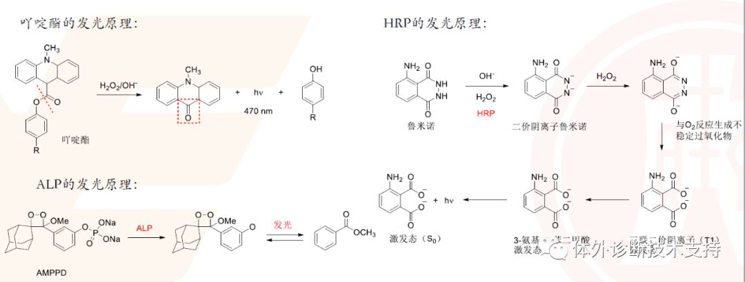 抗体/抗原表面具有多个活化基团(氨基/羧基),通过这些基团连接酶与抗体称为酶标记; 酶标记分为大分子与大分子标记、大分子与小分子标记; 变量多:抗体对的配对、“磁珠”与“酶标”的稀释度、合适的“配方”溶液、其他的试剂盒组分、孵育时间 化学发光:由于化学反应(通常是氧化)底物从基态跃迁为激发态,激发态返回基态时,跃迁能量以光子形式释放的现象。 综合来看,主流的5大发光技术各有优缺点,不能说技术谁优谁劣,但是从市场来看,Roche的电化学发光技术市场认可度稍稍领先;