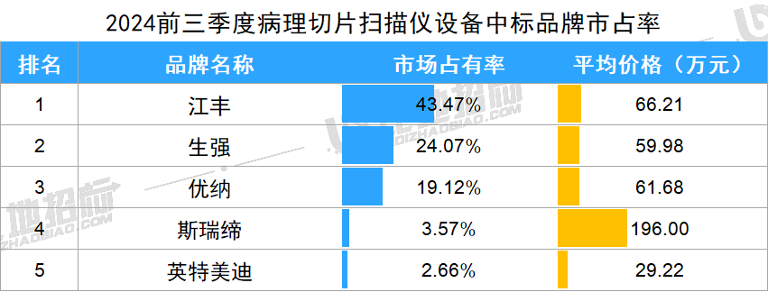 据比地招标网统计:2024年前三季度,病理切片扫描仪招投标市场有102家采购单位,82家中标单位,中标设备数量达125台,中标总金额约1.03亿元。 (产品关键词:病理切片扫描仪、数字病理切片扫描仪、玻片扫描影像系统等) 01 品牌市占率 设备品牌方面,金额市占率较高的品牌有江丰、生强、优纳,市占分别为43.47%、24.07%、19.12%。前3品牌合计占比达87%,品牌集中度非常高。 数据来源:比地招标网 02 区域占比与价格 区域方面,湖北、浙江、广东,中标金额占比分别为44.79%、9.84%、8.84%,前三区域合计占比达63%,区域集中度非常高。 价格方面,上海、黑龙江、广东平均金额相对较高,平均单价分别为120.00万元、97.97万元、94.91万元;四川、贵州平均金额相对较低,平均单价分别为20.07万元、19.51万元。 数据来源:比地招标网 03 TOP地区品牌偏好 不同地区对品牌的偏好有所不同,湖北偏好优纳、生强、江丰;浙江偏好江丰;广东偏好斯瑞缔、江丰、生强等。 数据来源:比地招标网 04 主流品牌型号 主要品牌型号金额占比&价格 主流品牌型号包括,江丰的KF-SCAN-BS、KF-PRO-005、KF-PRO-120;生强的SQS-120P、SQS-600P、SQS-12P;优纳的PRECICE610X2、PRECICE610X1等。 数据来源:比地招标网 05 主要采购人 主要采购单位及对应中标品牌包括:鄂州市中心医院(江丰),潜江市中心医院(生强),安陆市普爱医院(人民医院)(优纳)等。 TOP3品牌型号采购人采购金额占比 数据来源:比地招标网 06 主要供应商 主要供应商及对应中标品牌包括:泓康(山东)医疗科技有限公司(江丰),中移系统集成有限公司(生强),中电信数智科技有限公司(优纳)等。 TOP3品牌型号供应商中标金额占比 数据来源:比地招标网 // 数据说明 文丨比地招标研究院 统计时段:2024年1月1日~2024年09月30日 产品关键词:病理切片扫描仪、数字病理切片扫描仪、玻片扫描影像系统等。 数据来源:各政府采购、公共资源交易中心、企事业单位等网站公开的招标采购项目信息,基于招标采购大数据挖掘分析整理。 报告声明:本报告数据来源于各类型采购信息公开网站的采购项目信息,由于采购信息的非完全披露所导至的误差等原因,各项数据及指标仅供参考。 |