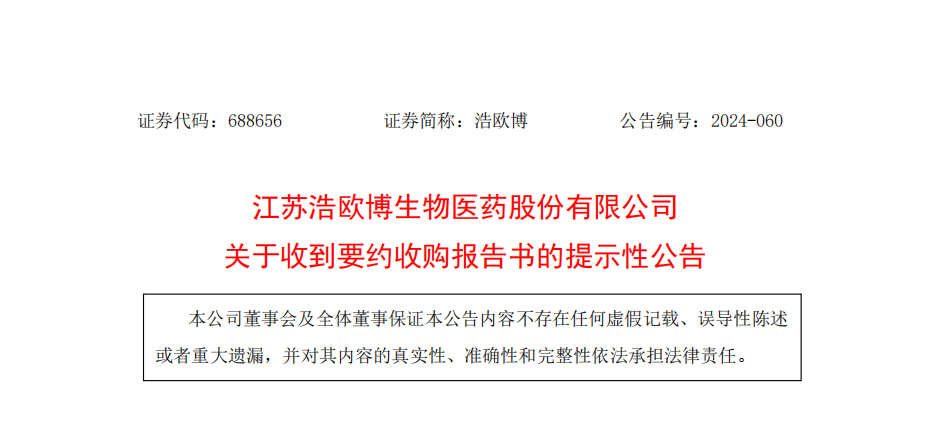 2024年12月19日,浩欧博收到双润正安信息咨询(北京)有限公司(发来的《江苏浩欧博生物医药股份有限公司要约收购报告书》。本次要约收购相关情况如下:1. 收购人及背景- 收购人为双润正安,成立于2020年10月15日,注册资本10万元人民币,法定代表人谢承润。其一致行动人为北京辉煌润康医药发展有限公司,成立于2021年5月6日,注册资本15万元人民币,法定代表人亦为谢承润。二者控股股东为正大制药投资(北京)有限公司,实际控制人为中国生物制药有限公司。