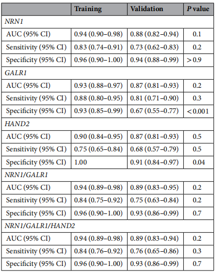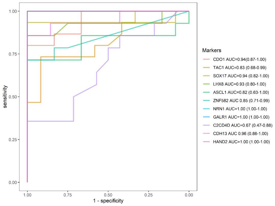 膀胱癌(BC)通常表现为无痛性血尿,通过膀胱镜检查诊断,然后经尿道行膀胱肿瘤切除术(TURBT)。虽然膀胱镜检查是发现和监测复发性疾病的可靠诊断工具,但它是侵入性的,昂贵的,需要经常去医院,并且有尿毒症等并发症的风险。因此,需要一种具有成本效益和非侵入性的检查方法来检测原发性和复发性BC。因此,开发具有强大诊断能力和易于应用于临床和门诊环境的无创BC尿液生物标志物是一项主要的临床需求。虽然DNA甲基化标记有希望,但诊断性能仍然可以提高。 近日,杂志Scientific reports上发表了一篇题为“Bladder cancer detection in urine by novel methylation markers”的文章。作者评估了11个候选甲基化标记物用于尿BC检测,确定了三个最有希望的标记:NRN1,GALR1和HAND2。联用标记物集显示AUC为0.94,敏感性为84%,特异性为96%。验证集获得了几乎相同的准确度 (AUC 0.89,敏感性76%,特异性93%)。根据临床情况,DCA提示膀胱镜检查可能减少20%至35%。此甲基化标记物在非侵入性BC检测中的出色诊断潜力,强调了它们对未来诊断策略的重要性。 图片来源:Scientific reports 主要内容 候选BC甲基化标记物的评价和选择 在15名对照组和15名原发性BC患者的尿细胞沉淀中评估了11种候选标记物(CDO1、TAC1、SOX17、LHX8、ASCL1、ZNF582、NRN1、GALR1、C2CD4D、CDH13和HAND2)的DNA甲基化水平。除C2CD4D外,病例中所有标记物的甲基化水平均显著高于对照组。三个标记NRN1, GALR1和HAND2表现出完美的诊断性能,AUC为1.00(如下图),因此选择它们进行后续的训练和验证。 候选BC甲基化标记物的评价。图片来源:Scientific reports 训练集DNA甲基化分析检测BC的诊断性能 检测69例对照和77例原发性BC患者尿细胞沉淀中NRN1、GALR1和HAND2标记物的DNA甲基化水平。这三种标志物的甲基化水平在BC患者中显著高于对照组(均P < 0.001)。NRN1的AUC为0.94,GALR1的AUC为0.93,HAND2的AUC为0.90。相应的敏感性和特异性NRN1分别为83%和96%,GALR1为88%和93%,HAND2为75%和100%(如下表)。联用结果显示NRN1/GALR1联用结果最佳,其AUC为0.94,敏感度为84%,特异性为96%。(如下表)。 3个基因甲基化分析检测BC的诊断性能。 图片来源:Scientific reports 验证集DNA甲基化分析检测BC的诊断性能 研究结果在一个独立的队列中得到验证,该队列显示BC患者NRN1、GALR1和HAND2的甲基化水平明显高于对照组(均P < 0.001,如下图)。在验证队列中的诊断表现导至NRN1的可比AUC为0.88,GALR1为0.87,HAND2为0.87。在验证队列中,NRN1/GALR1和NRN1/GALR1/HAND2标记板的性能几乎相等,AUC分别为0.89和0.89(如上表)。 验证队列中NRN1/GALR1/HAND2的甲基化水平。 图片来源:Scientific reports 甲基化标记物的临床应用 作者通过计算使用甲基化标记可能避免的膀胱镜检查次数来评估甲基化标志物在日常临床实践中的临床效用。假设显微镜下血尿患者的BC患病率为5%,肉眼血尿患者的BC患病率为15%,无论选择的风险阈值如何,使用我们的标记物都可以减少膀胱镜检查(如下图)。例如,通过在显微镜下血尿中使用风险阈值为10%的NRN1/GALR1标记组,可以避免约30%的膀胱镜检查,而不会遗漏任何癌症。 甲基化标记物的临床应用。图片来源:Scientific reports 总结与讨论 在这项前瞻性生物标志物研究中,作者定义了一个由3个基因(NRN1、GALR1和HAND 2)组成的新型甲基化标记组,用于在家中收集的尿液中检测BC。NRN1/GALR1和NRN1/GALR1/HAND2联合检测的AUC为0.94,相应的灵敏度为84%,特异性为96%。结果在独立验证队列中得到证实(AUC为0.89,敏感性为75%/76%,特异性为93%),表明其检测尿液中原发性BC的稳健性。 此研究的一个局限性是只包括原发肿瘤,这限制了研究结果对监测环境的直接适用性。此外,需要监测研究来验证复发肿瘤。本研究的优势在于新型尿液BC检测标记物具有优异的诊断性能,并且可以在家中收集尿液,并通过常规邮件发送到任何实验室,使其成为日常临床护理中易于应用且真正无创的方法。总之,研究表明,DNA甲基化标记NRN1、GALR1和HAND2在非侵入性检测BC方面具有良好的诊断潜力,并且这些标记能够大大减少膀胱镜检查的次数。这些发现强调了DNA甲基化标记在未来BC诊断中的高诊断潜力。 |