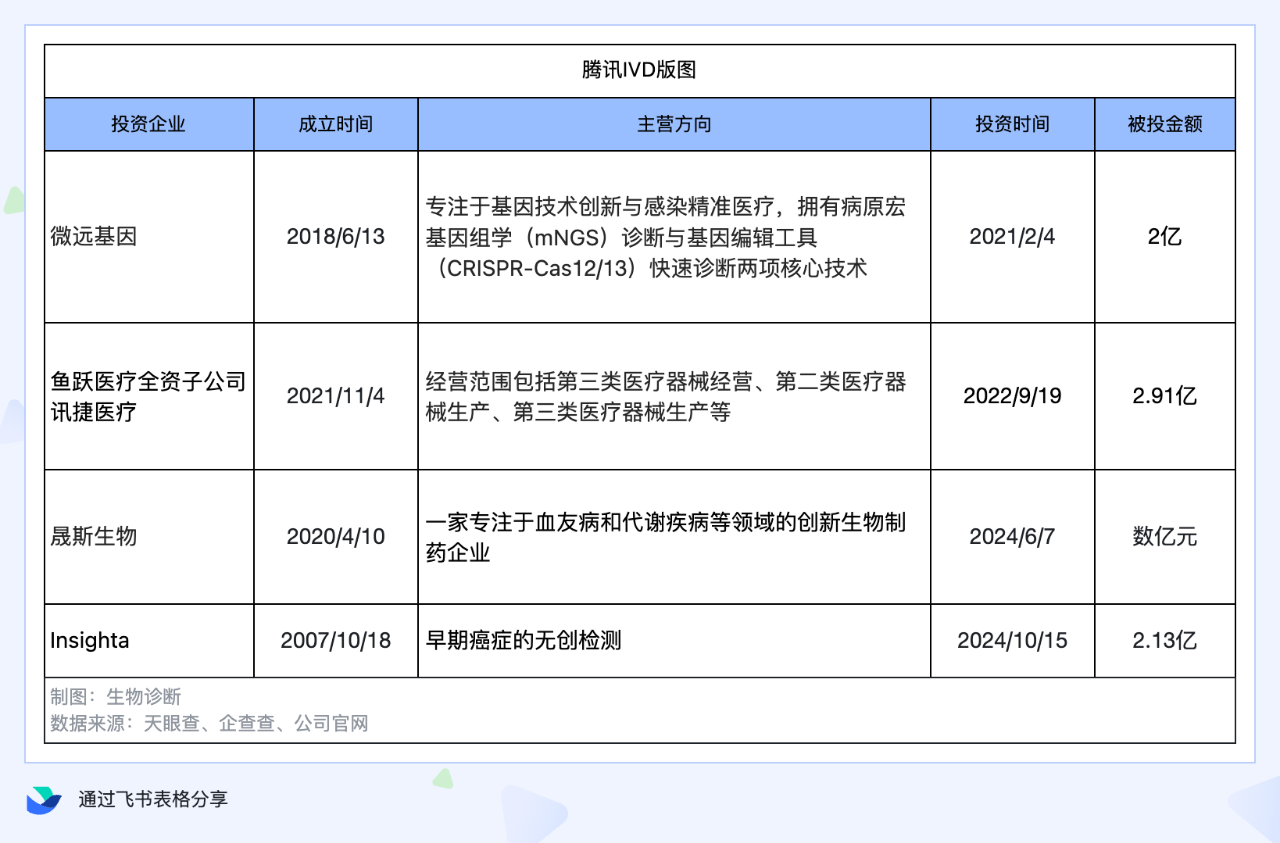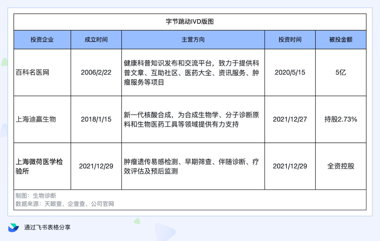 ID:SinoIVD 字节跳动、阿里巴巴、腾讯等互联网巨头,争先涌入IVD赛道。 巨头之间的版图扩张绝非偶然,竞争的背后,是精准锚定了IVD巨大的市场潜力和创新力。 根据国际IVD市场研究出版商Kalorama Information报告: “ 2023年中国IVD市场规模为58.55亿美元,预计2028年将达79.6亿美元,年复合增长率远高于全球IVD市场。” 当“闯入者”携资本、技术、流量入局时,一场关乎市场份额的攻防战就此打响。 一方面,互联网巨头凭借电商优势能够让IVD产品打破地域限制,直面终端消费者和医疗机构,传统供应商分销模式将遭受严重冲击; 另一方面,AI算法掀起的创新风暴中,如何快速融合最新的科技成果,成为悬在老牌IVD大厂头顶的达摩克利斯之剑。 未来,全新 IVD 产业链或许将在巨头角逐间逐渐成型。 字节跳动抢先入局 早在2020年,手握抖音、资讯、企服等多个重量级产品的字节,就开始在医疗领域谋篇布局,收购医学科普知识平台 “百科名医网”; 2021年12月,通过间接入股上海迪赢生物科技有限公司,正式杀入IVD领域; 2022年,字节跳动正式成立上海微荷医学检验所有限公司,落地苏州工业园区;2024年,微荷医学“无创泛癌种早筛技术产业化项目”正式开业。 整体来看,字节在IVD领域采用循序渐进,多点切入的策略。以擅长的“内容”为排头兵,通过技术和自建医学检验所来落地深耕,吸引产业链上下游资源聚集,形成产业集聚效应,逐步夯实自己的行业地位。 阿里紧跟其上 巨头间的开疆扩土,比拼的就是速度。 2021年,阿里通过领投、联投、战略合作的方式,一口气投资6家IVD企业,从1月一直贯穿到10月,对IVD重视程度可见一斑。 目前,阿里的IVD矩阵包括,山东英盛生物、和瑞基因、北京吉因加科技、杰毅生物、康立明生物等知名 IVD 企业。 通过多点布局,阿里快速构建起了一个较为全面的 IVD 矩阵,涵盖了生化诊断、肿瘤早筛、基因检测、感染精准诊断等多个细分赛道,在面对不同的临床需求、疾病类型以及市场机会时,都能有对应的企业和产品参与其中,提升整体的竞争力。 腾讯跑步进场 相比于字节和阿里,腾讯在IVD的布局上整整慢了一拍。 虽然在2021年投资了微远基因,但并没有持续发力,直到2024年下半年,才先后投资了晟斯生物和香港的Insighta,投资金额方面,也比阿里和自字节差了一大截。 总体来看,腾讯在 IVD 领域的投资策略,经历了从谨慎探索到战略调整的过程,注重投资的稳健性、以及重点项目的深度挖掘。 虽然在布局速度和投资金额上比字节、阿里稍慢、较少,但通过投资晟斯生物(血友病创新药公司)以及香港的 Insighta ,意图从地域和业务多元化的角度出发,逐步构建自己的 IVD 投资版图。 互联网巨头的涌入,给IVD技术迭代按下了加速键。 在AI、大数据处理、算法等方面,巨头有着深厚的积累,能够将这些优势应用到IVD技术创新和更多的场景应用中。 字节聚焦癌症早筛与检测技术创新 字节的优势是算法,利用自身强大的 AI 算法,能够辅助医生进行病理图像分析,同时以微荷医学以癌症早筛为切入点,开发了比肩国际的 cfDNA 提取、甲基化酶转化、靶向测序基因文库试剂和自动化文库构建仪等相关产品 ,致力于提供血液无创癌种早筛及组织溯源的检测技术产品。 微荷医学“无创泛癌种早筛技术产业化项目”正式开业 阿里数字化平台搭建 在《财富》杂志公布的2024年“改变世界的公司”榜单中,阿里因善用AI技术辅助检测胰腺癌病变,成为唯一入选前十的中国公司。 财富榜单显示,