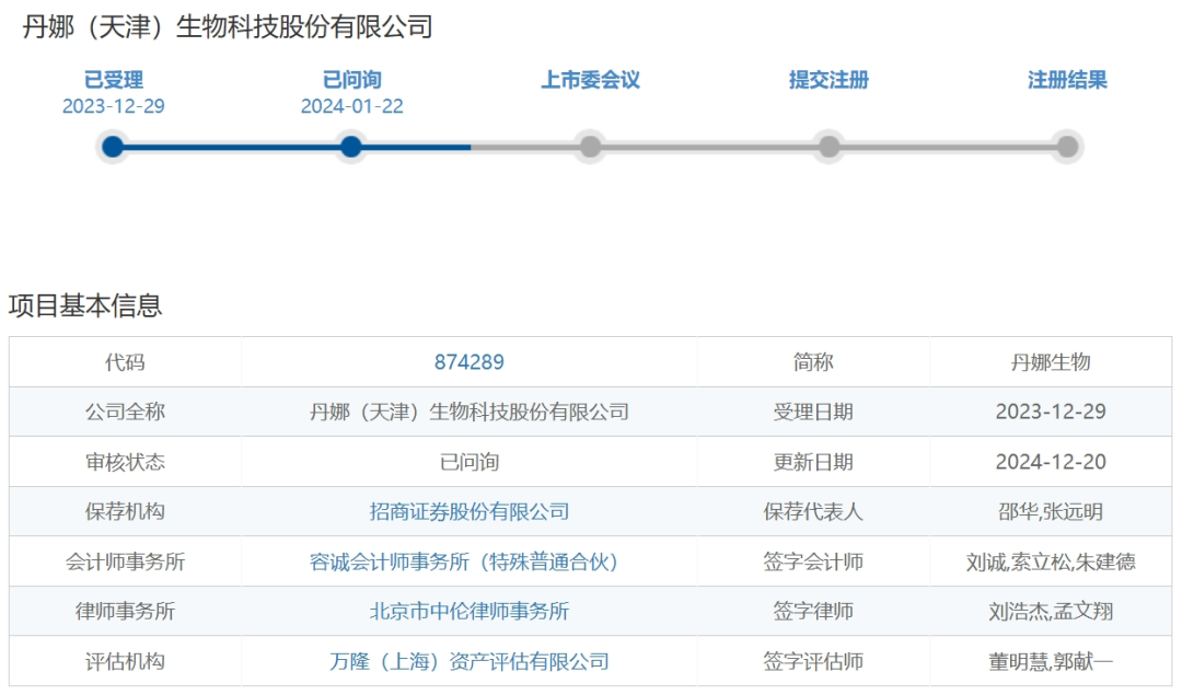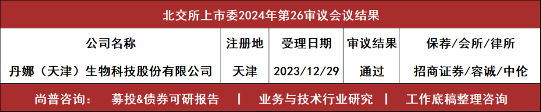 12月27日,北交所上市委举行了2024年第26次审议会议(参会委员:宣雷、杨欧、张胜、李检华、时晋),共审议1家企业,丹娜生物北交所IPO获通过。  丹娜生物成立于2014年,公司主要从事侵袭性真菌病血清学早期诊断及其它病原微生物体外诊断产品的研发、 生产和销售,被认定为国家高新技术企业、第一批国家支持的重点专精特新“小巨人”企业、天津市制造业单项冠军企业、国家知识产权优势企业。根据《国民经济行业分类》(GB/T4754-2017),公司所处行业属于“C27医药制造业”之“C2770卫生材料及医药用品制造”。根据《战略性新兴产业分类(2018)》,公司所处行业属于“4生物产业”之“4.2生物医学工程产业”之“4.2.3其他生物医用材料及用品制造”产业。ZHOUZEQI(周泽奇)直接持有公司34.0923%的股份,并担任公司员工持股平台丹娜道利和丹娜道和执行事务合伙人,通过丹娜道利和丹娜道和间接合计控制公司5.3542%的股份,ZHOUZEQI(周泽奇)直接和间接共控制公司39.4465%的股份,为公司控股股东和实际控制人。2021年至2024年1-6月,公司实现营业收入分别为2.34亿元、2.95亿元、2.37亿元和1.18亿元,实现扣非后净利润分别为4,415.36万元、4,226.20万元、6,847.45万元和3,880.38万元。