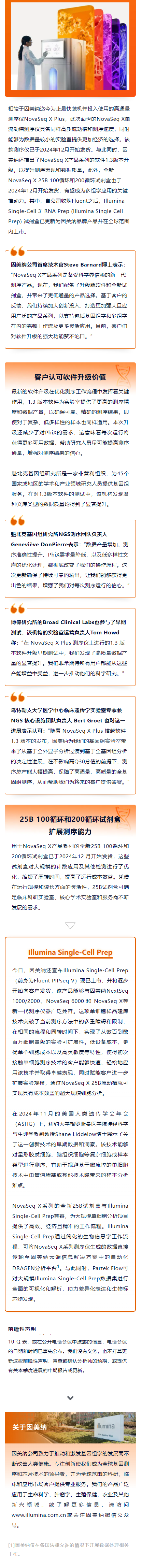 • 软件升级推动完整工作流解决方案 • 全新NovaSeq X 25B 100循环及200循环试剂盒提升NovaSeq X多组学能力,支持最新发布的Illumina Single-Cell Prep 相较于因美纳迄今为止最快装机并投入使用的高通量测序仪NovaSeq X Plus,此次面世的NovaSeq X单流动槽测序仪具备同样高质流动槽和测序速度,同时能够为数据量较小的实验室提供更加经济的选择。该款测序仪已于2024年12月开始发货。与此同时,因美纳还推出了NovaSeq X产品系列的软件1.3版本升级,以提升测序表现和数据质量。此外,全新NovaSeq X 25B 100循环和200循环试剂盒也于2024年12月开始发货,有望成为多组学应用的关键推动力。其中,自公司收购Fluent之后,Illumina Single-Cell 3’ RNA Prep (Illumina Single Cell Prep) 试剂盒已更新为因美纳品牌产品并在全球范围内上市。 |