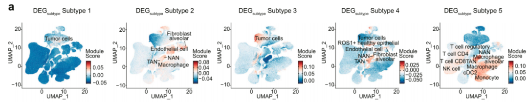作者基于细胞类型特异性评估了五种NSCLC亚型的肿瘤微环境,并确定每个亚型的差异表达基因(DEG)。在亚型1和3中,DEG富集了与肿瘤相关的细胞类型:亚型1和3 DEG分别对应于LUAD和LSCC有丝分裂细胞类型,表明肿瘤细胞成分增殖活跃(下图a)。相反,亚型2、4和5的DEG富含中性粒细胞。