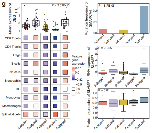 HTE特征基因在亚型5中表达最高,具有免疫原性特征。此外,在亚型5中观察到最高频率的SMARCA4突变和SLAMF7过表达(下图g,右)。研究结果显示,HTE肿瘤与NSCLC患者较好的预后呈正相关。这些肿瘤主要富集在免疫原性亚型5,该亚型也与SMARCA4的突变呈正相关,SMARCA4靶向免疫调节因子SLAMF7。