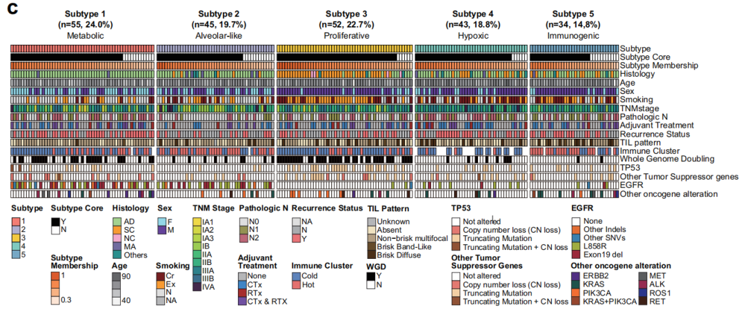多组学分析利用了229名确诊为非小细胞肺癌的韩国患者的回顾性队列,整合了蛋白质组学、磷酸化蛋白质组学和乙酰蛋白质组学数据,确定了五种多组学亚型:代谢性(亚型1)、肺泡样(亚型2)、增殖型(亚型3)、缺氧型(亚型4)和免疫原性(亚型5)(下图c)。