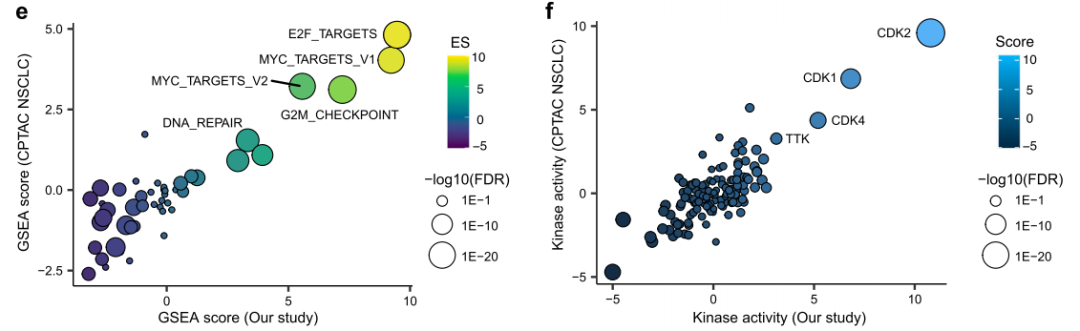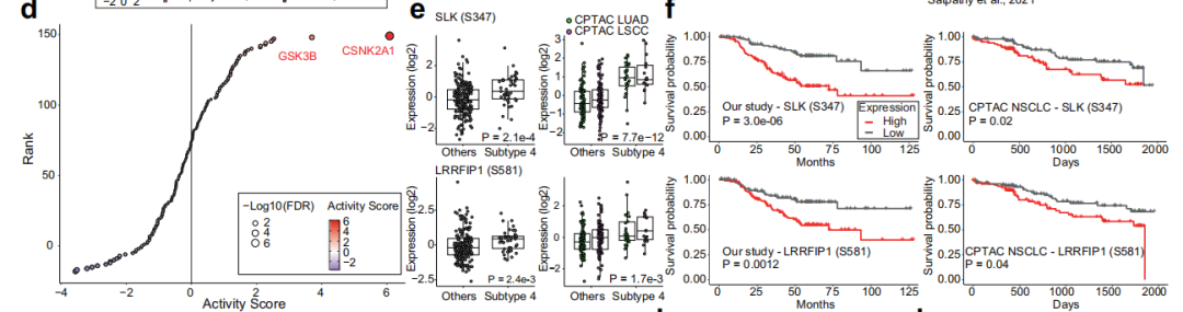 亚型4代表了一种NSCLC亚型,其转移比例高,生存结果差。亚型4中磷酸激酶相互作用是一个主要特征。CSNK2A1和GSK3B两种激酶显著富集(下图d),SLK(S347)和LRRFIP1 (S581)磷酸化增加,生存结果较差(下图e, f)。这些结果表明SLK和LRRFIP1参与肿瘤进展,可能是亚型4特异性的关键标志物。